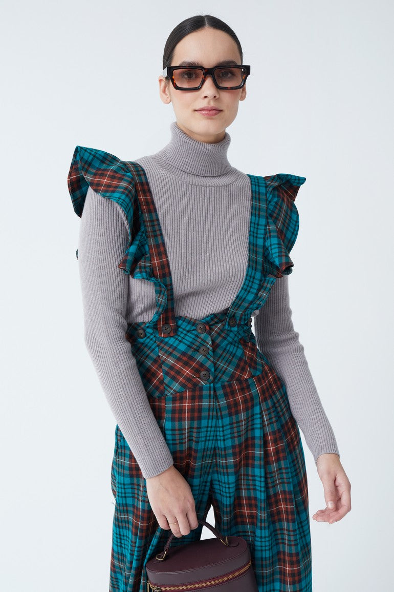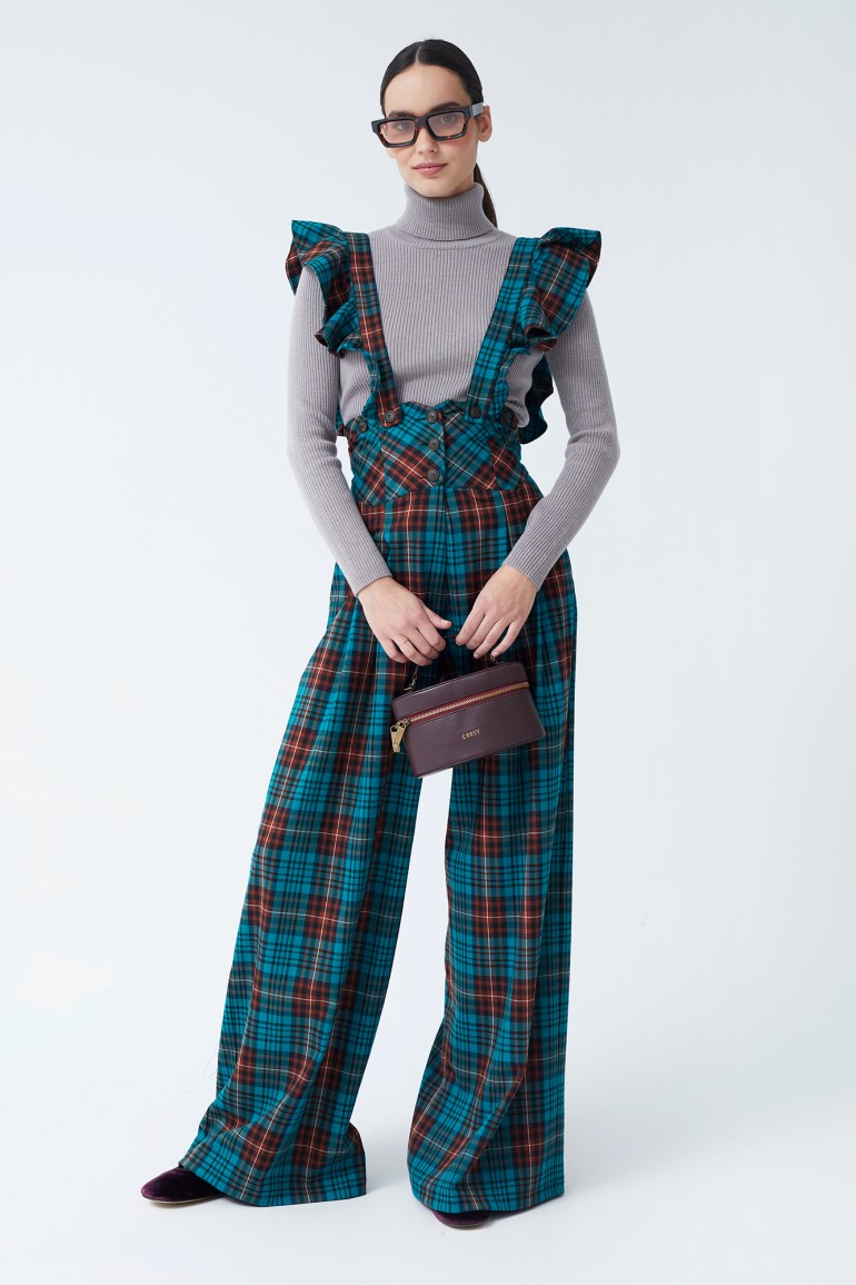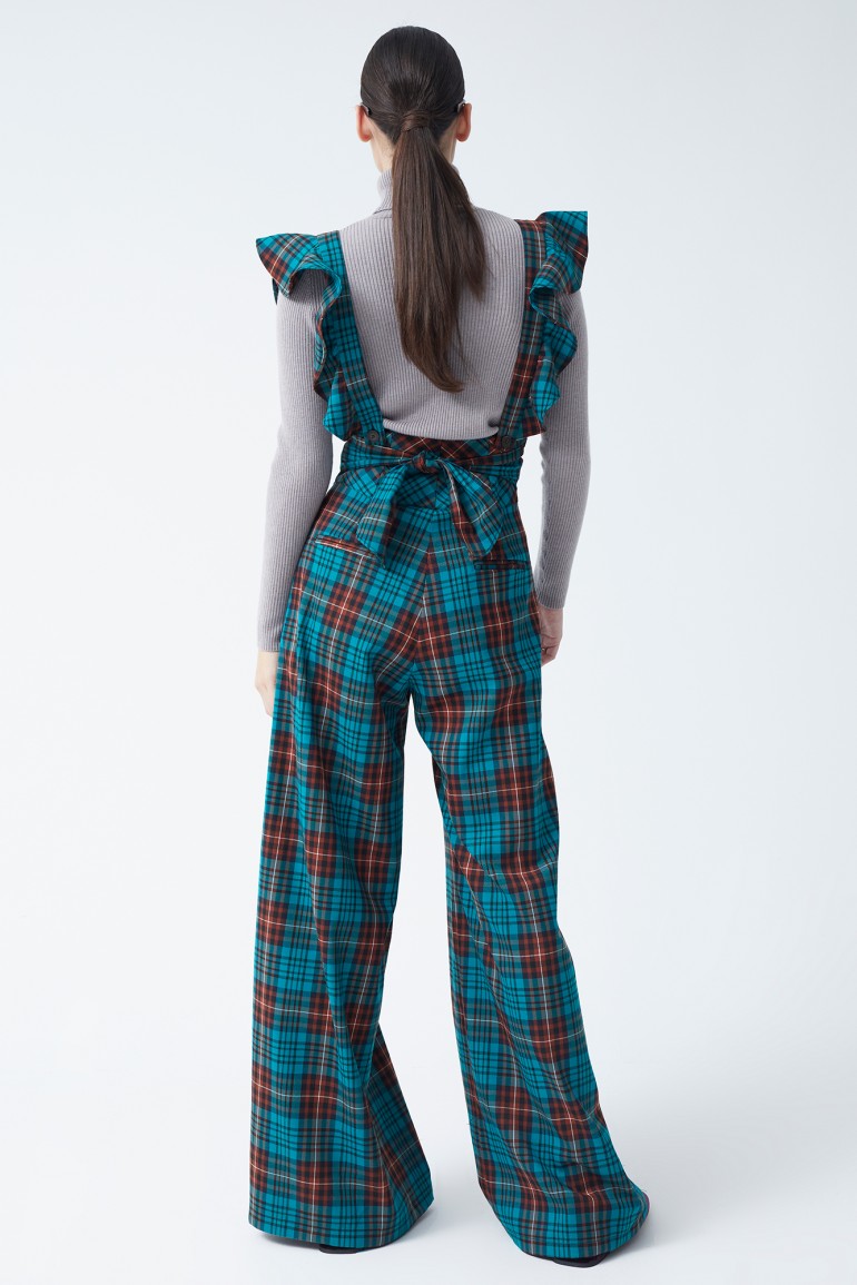 Luce un estilo impecable con nuestro mono largo de cuadros en tonos azul y naranja, adornado con volantes románticos en los tirantes. Con un corte de cintura alta y corte recto, este diseño favorece la silueta y aporta un aire retro chic ideal para eventos especiales o días en los que quieras destacar. Los detalles de botones en el frente y el lazo ajustable en la espalda añaden un toque femenino y sofisticado.