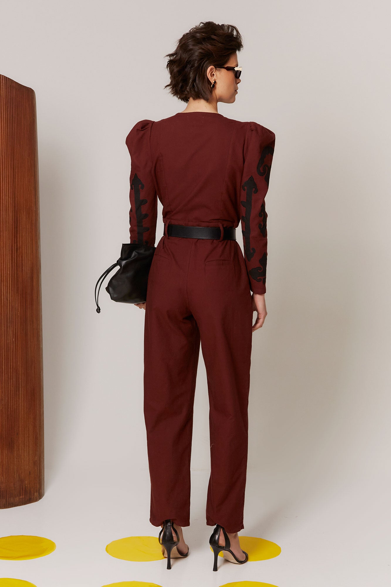 Su parte superior de cuello cerrado crea una línea limpia y refinada, mientras que las mangas largas con ligero volumen en hombros añaden estructura y un toque moderno. El corte recto de la pernera estiliza la figura, alargando visualmente la silueta y aportando movimiento al caminar.