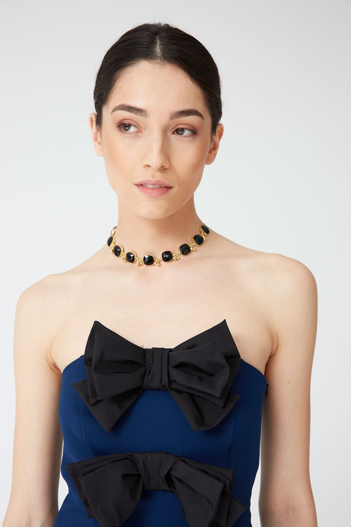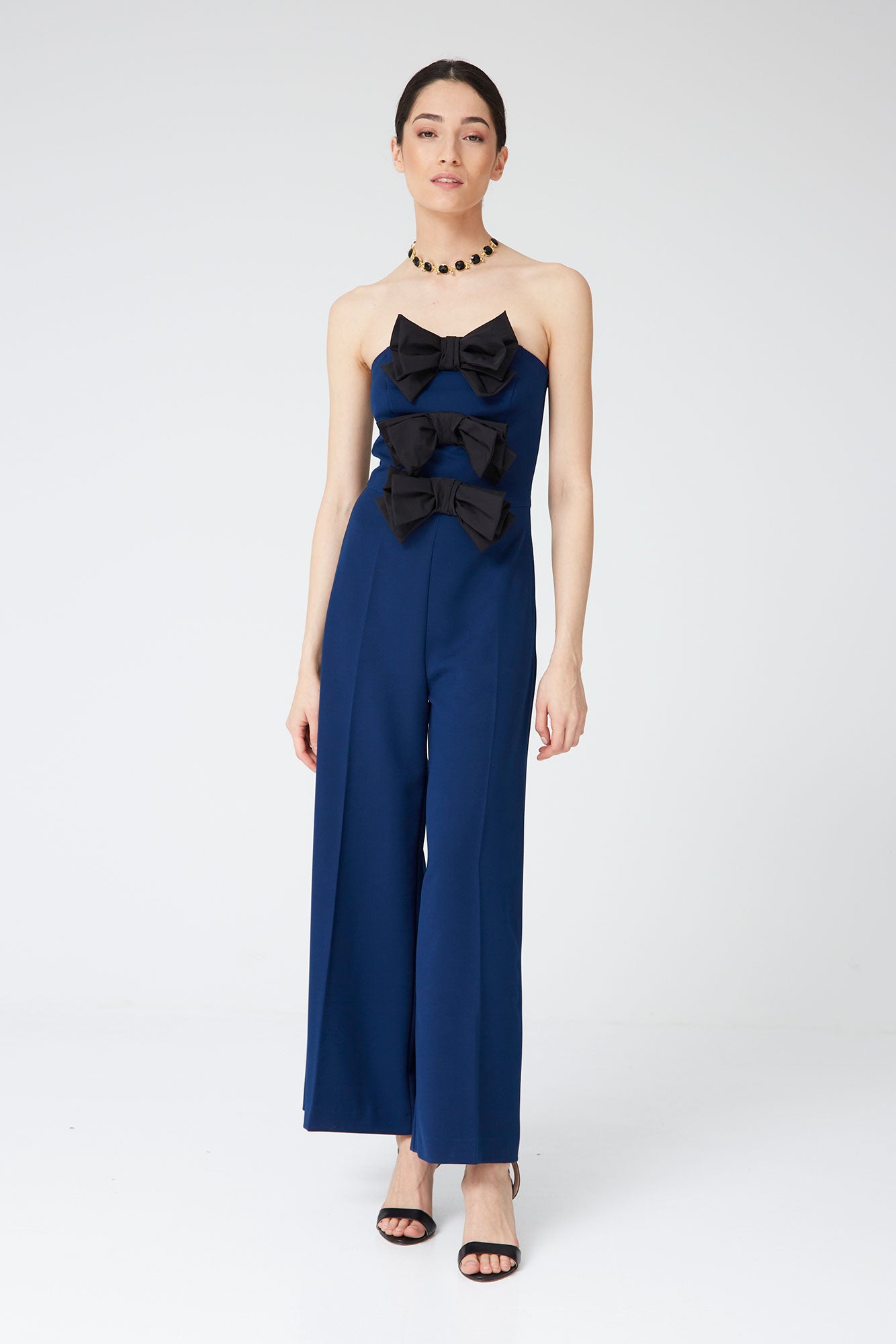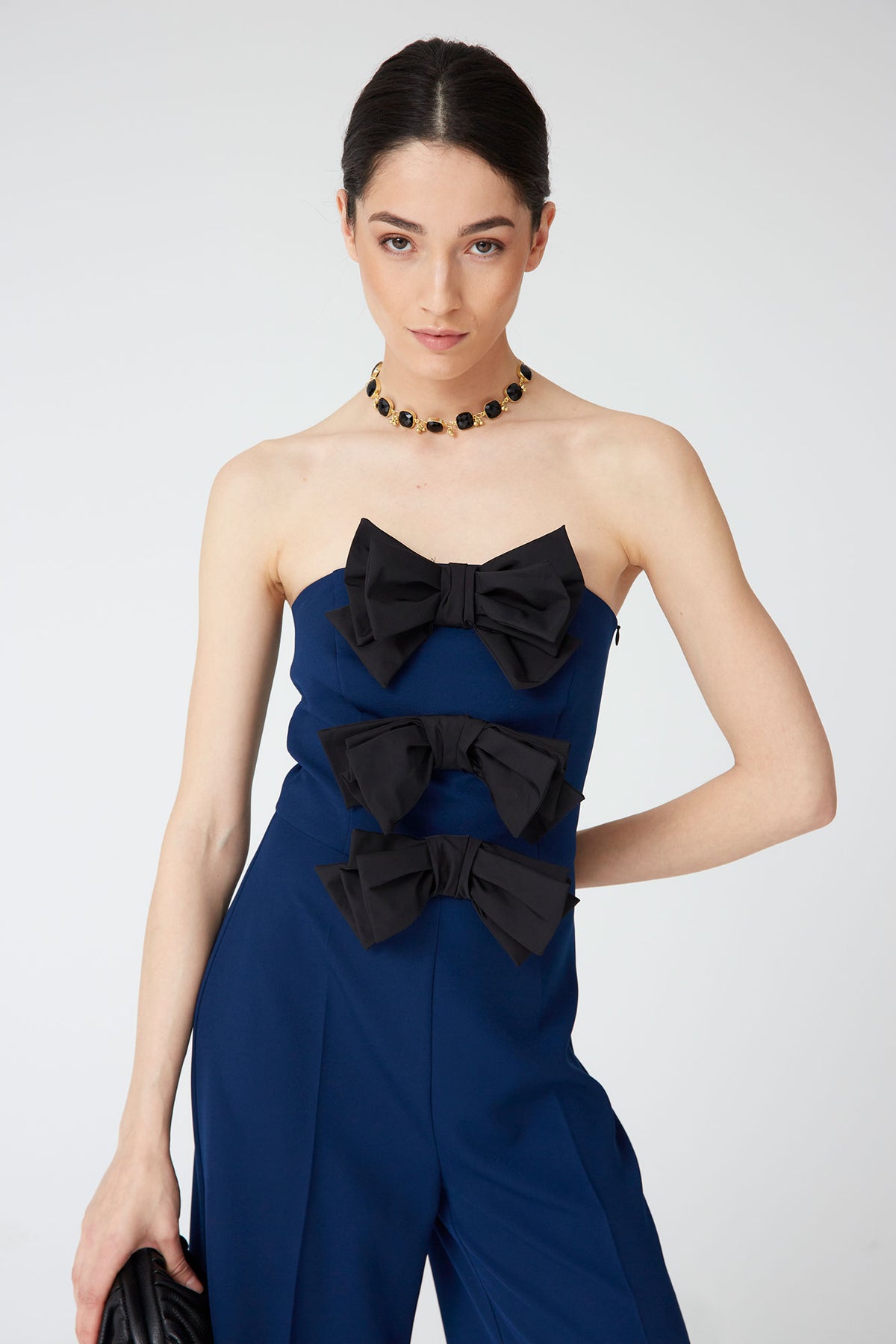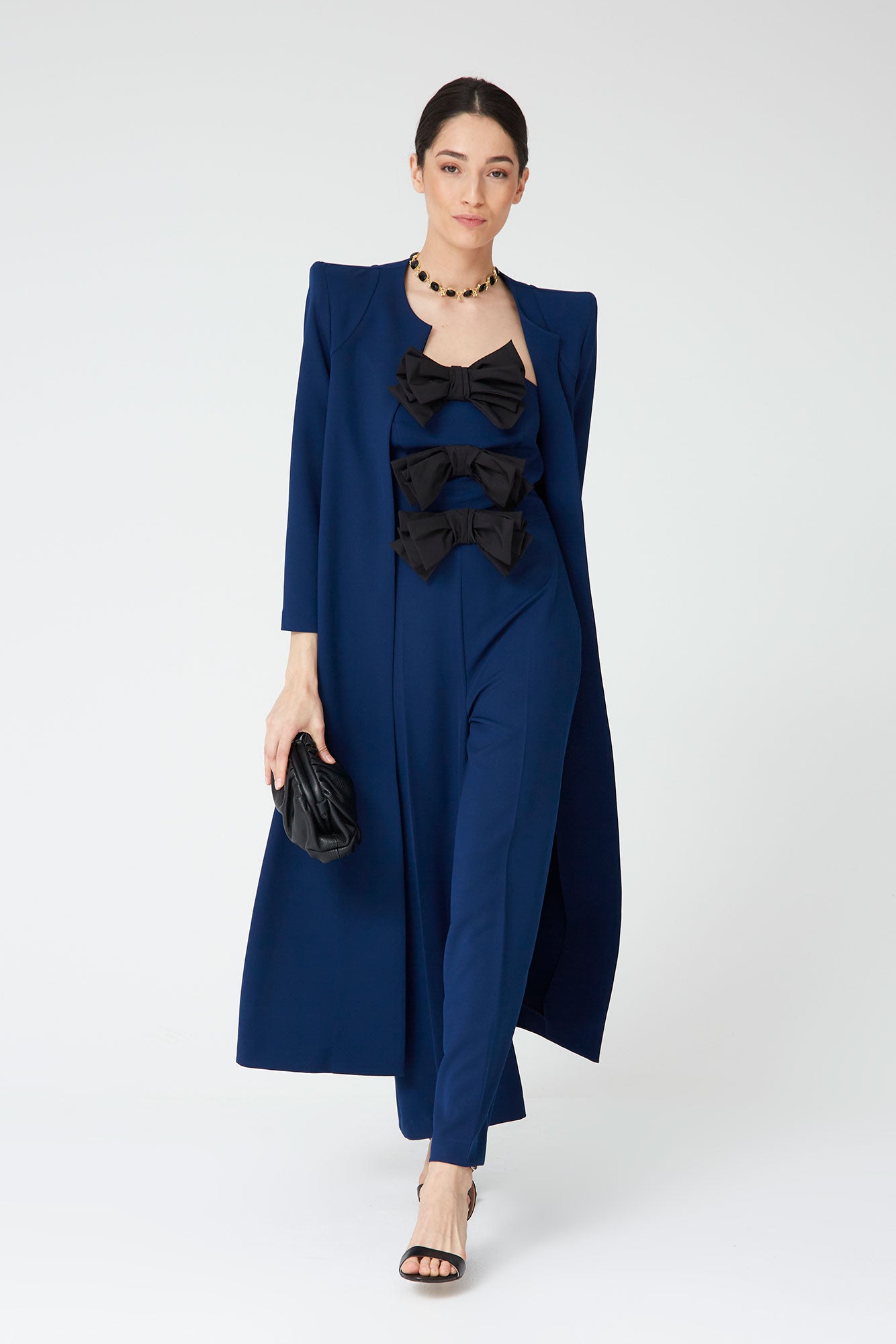 El Mono Gabriela es una prenda impactante y elegante, diseñada para convertirse en el centro de todas las miradas. Confeccionado en un favorecedor tono azul profundo, destaca por su escote palabra de honor y sus lazos negros en contraste colocados en el delantero, que aportan un aire sofisticado y muy femenino.