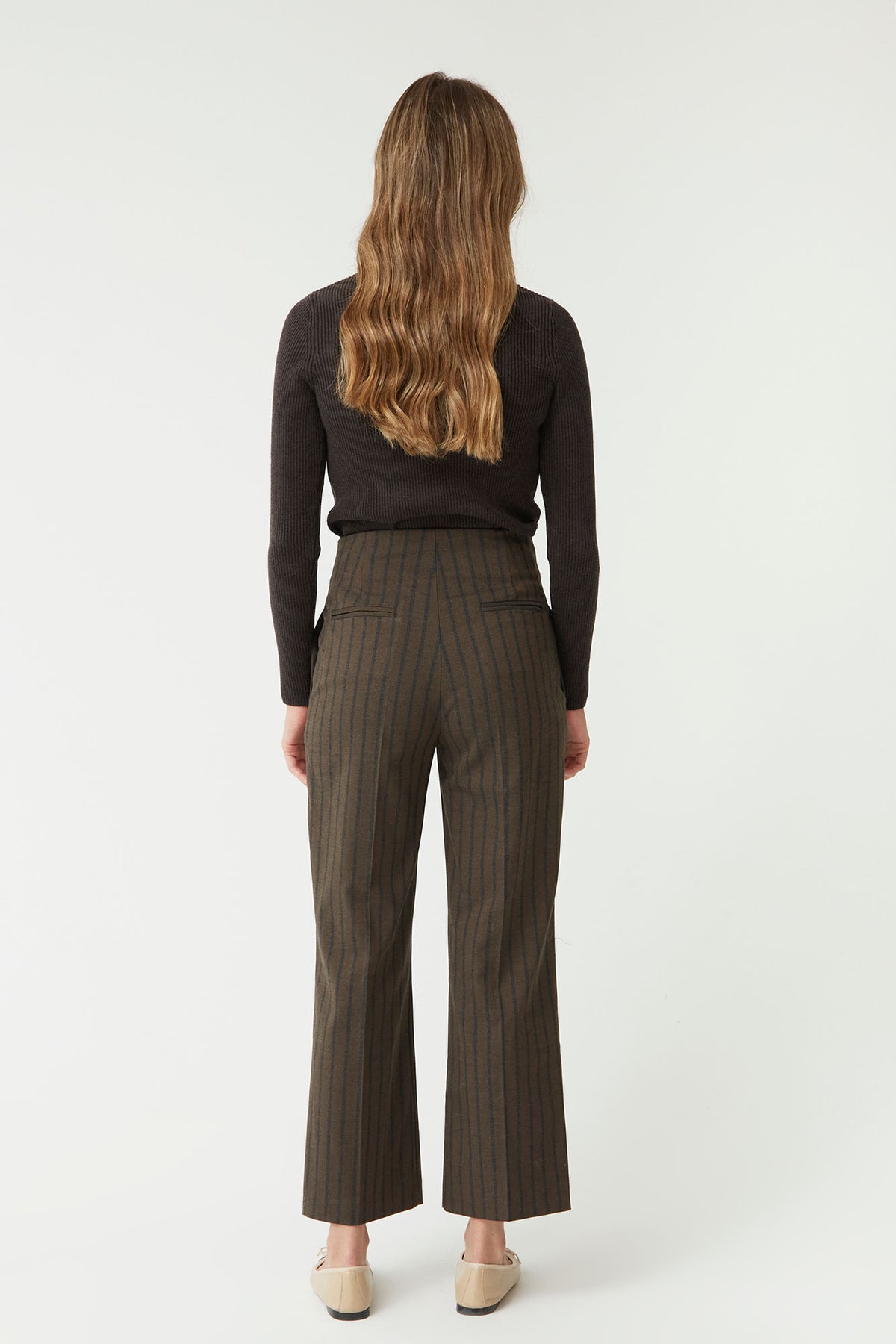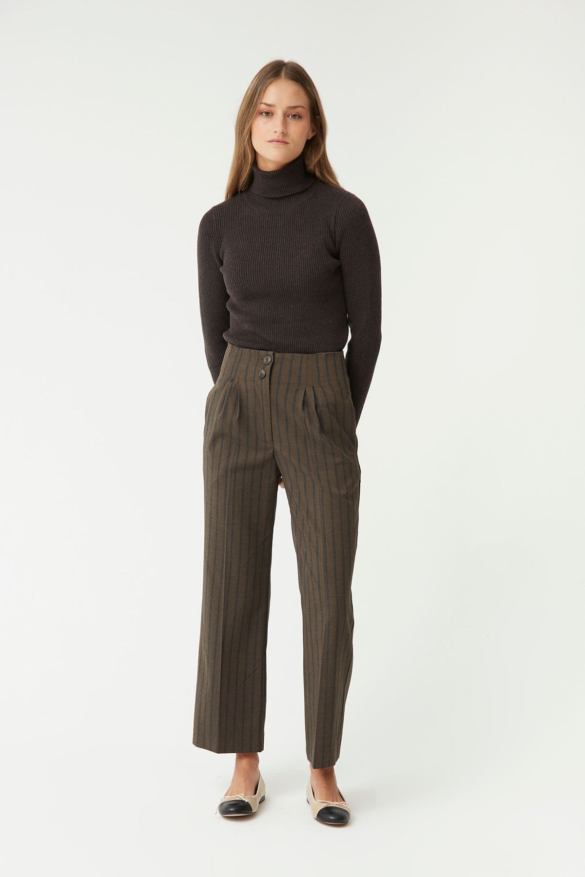 El pantalón de rayas marrón y gris de Coosy es una prenda versátil y elegante, perfecta para aportar estilo a tus looks de diario o de oficina. Su corte recto con pinzas delanteras estiliza la figura, mientras que el estampado de rayas verticales alarga visualmente las piernas y añade un toque de sofisticación.