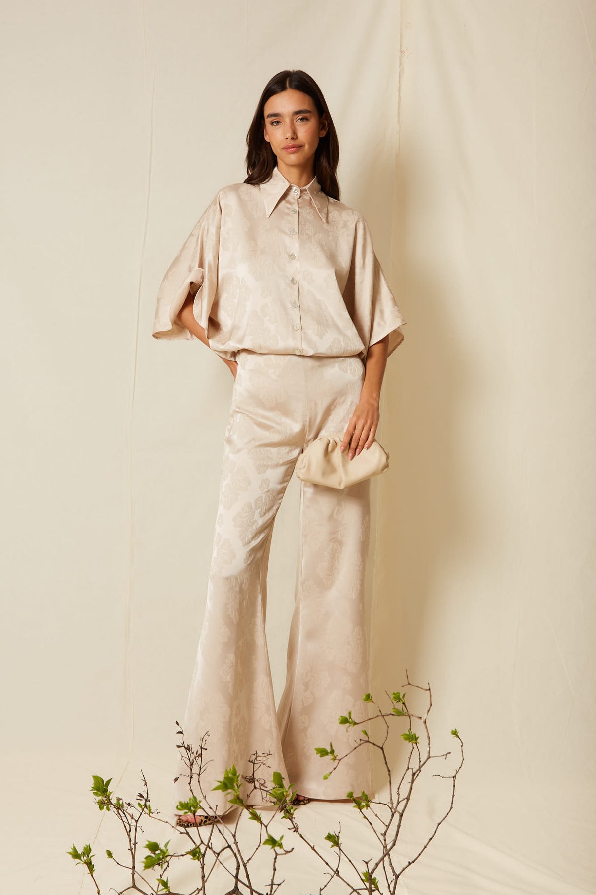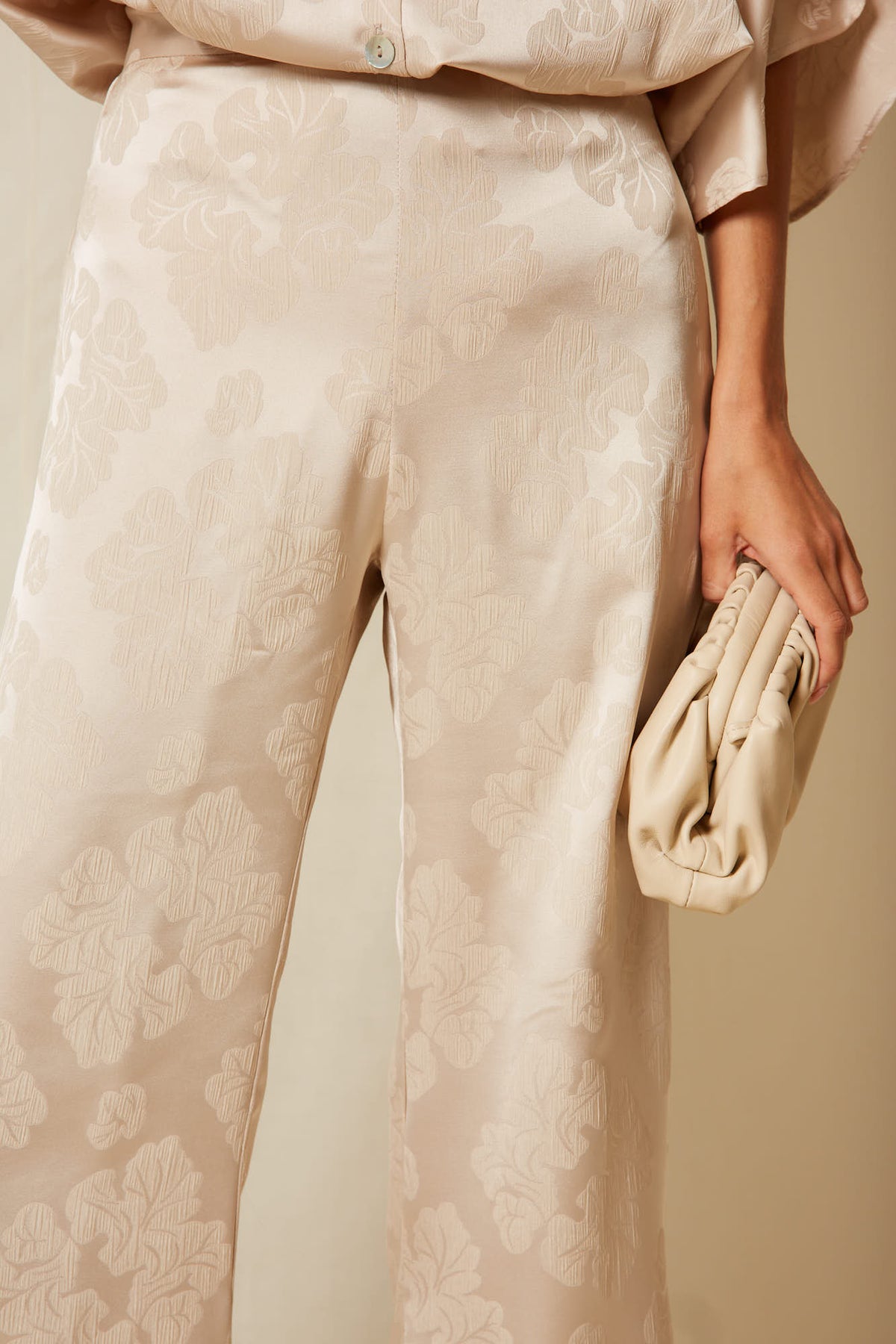 El tejido jacquard floral aporta riqueza visual y convierte esta prenda en una opción especial dentro del armario, perfecta para quienes buscan pantalones elegantes de mujer que destaquen sin perder la esencia minimalista.
