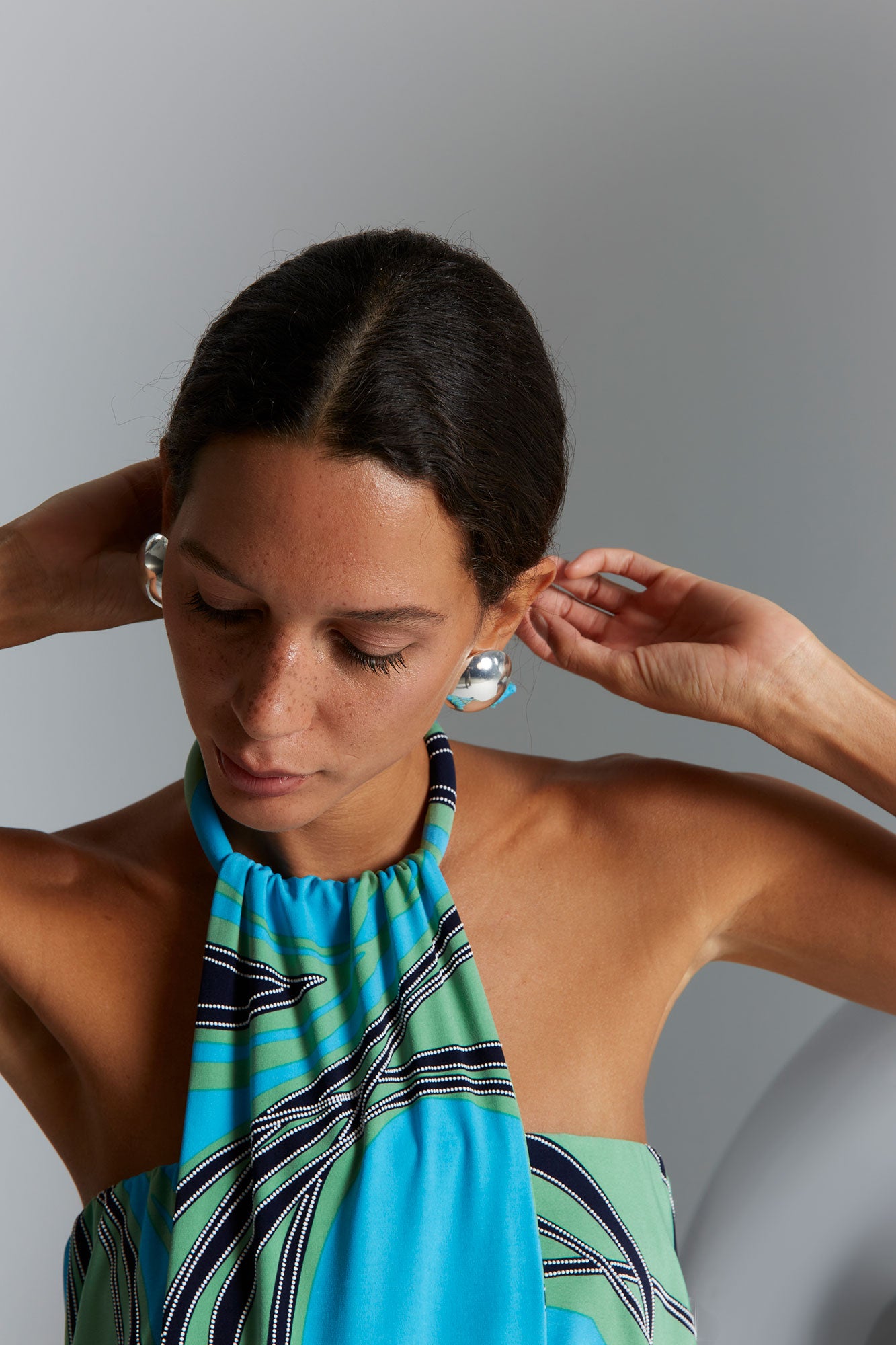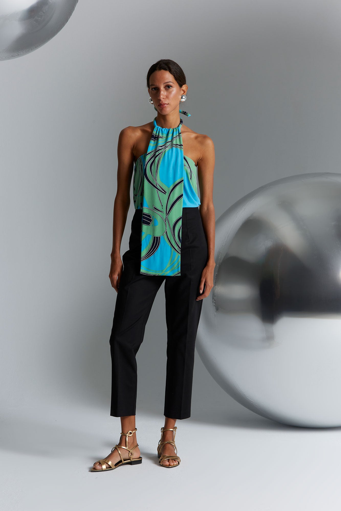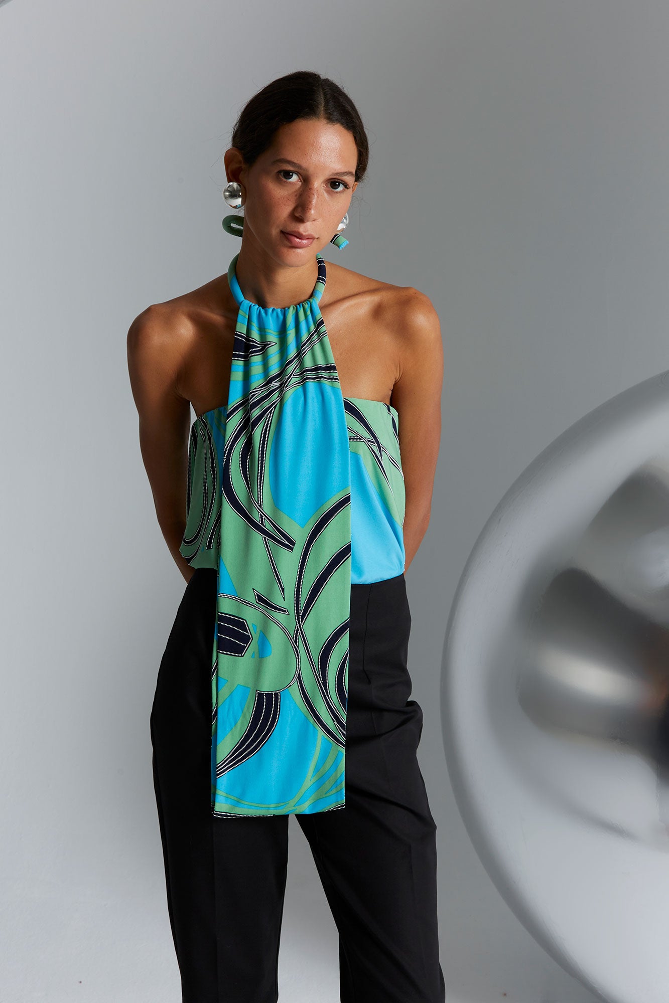 Confeccionado en tejido ligero con estampado gráfico en tonos turquesa, verde y azul, el diseño aporta dinamismo y profundidad visual a la prenda. Su escote halter fruncido en el cuello crea un efecto drapeado que aporta textura y movimiento, convirtiendo el tejido en el protagonista del diseño.