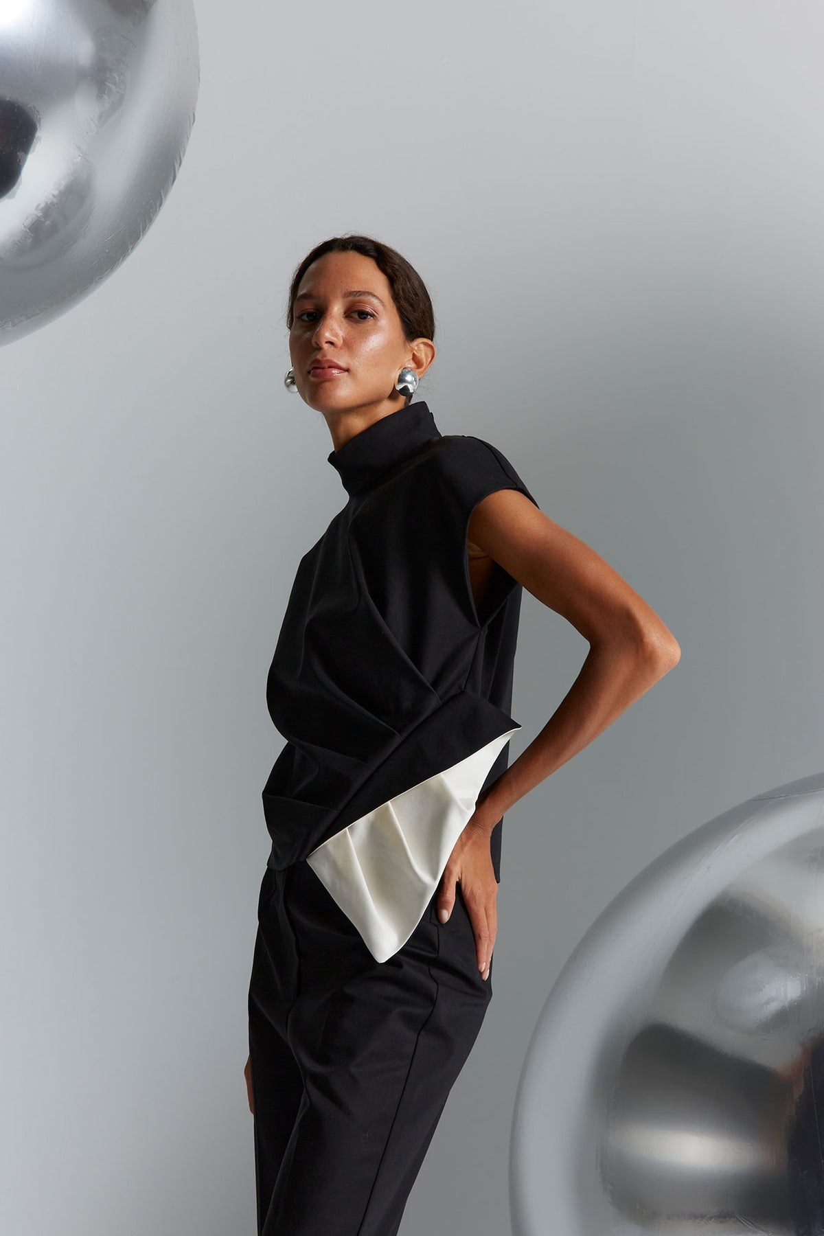 Este top negro estructurado forma parte de la colección Coosy x Miguel Palacio, una propuesta donde la arquitectura del diseño, la calidad del tejido y la precisión del patronaje se combinan para crear prendas con identidad propia dentro de la moda española contemporánea.