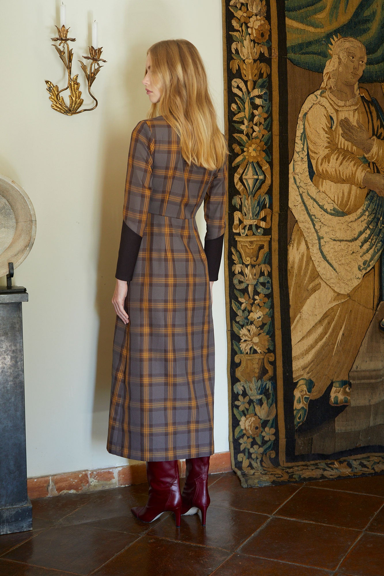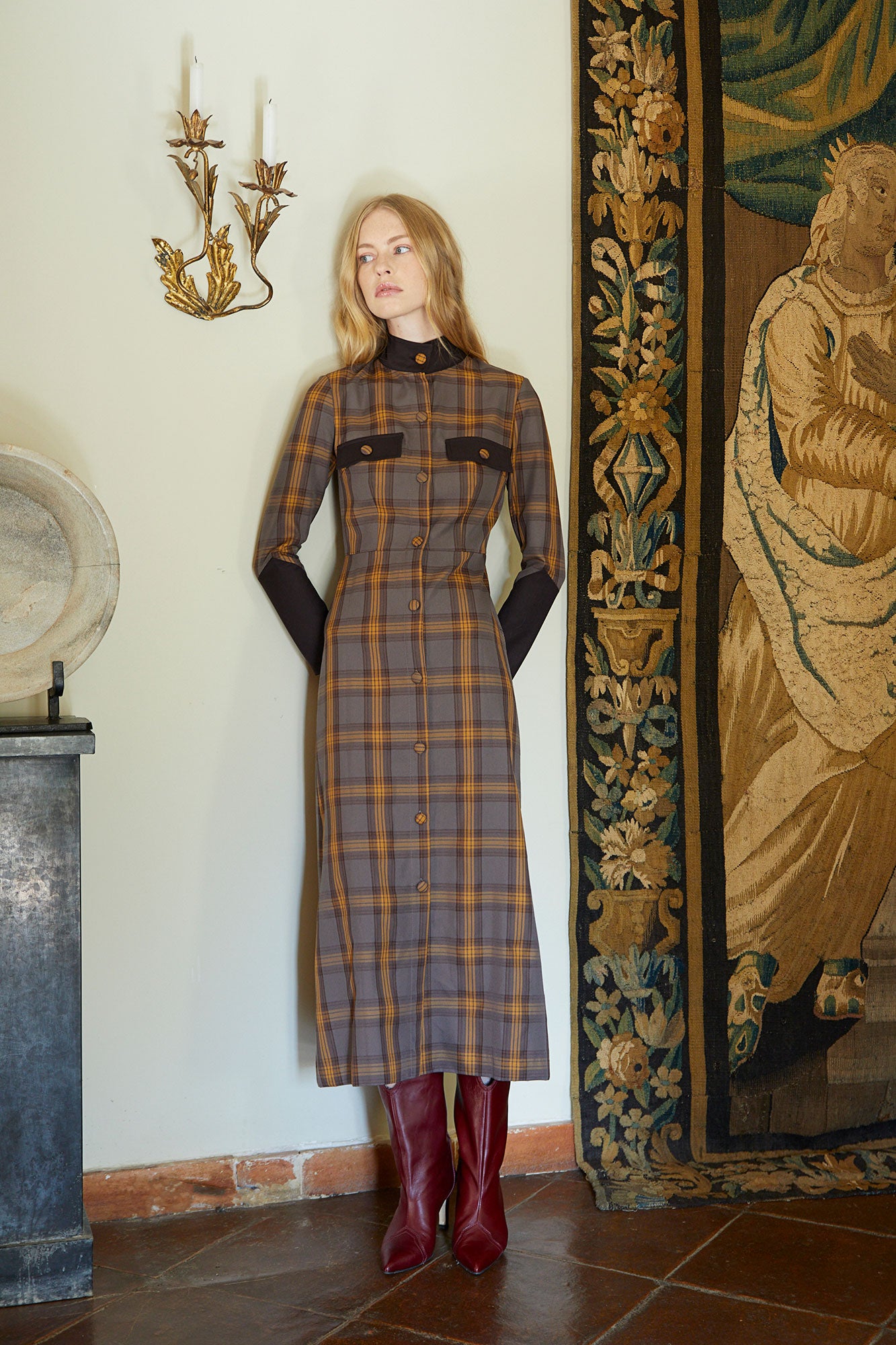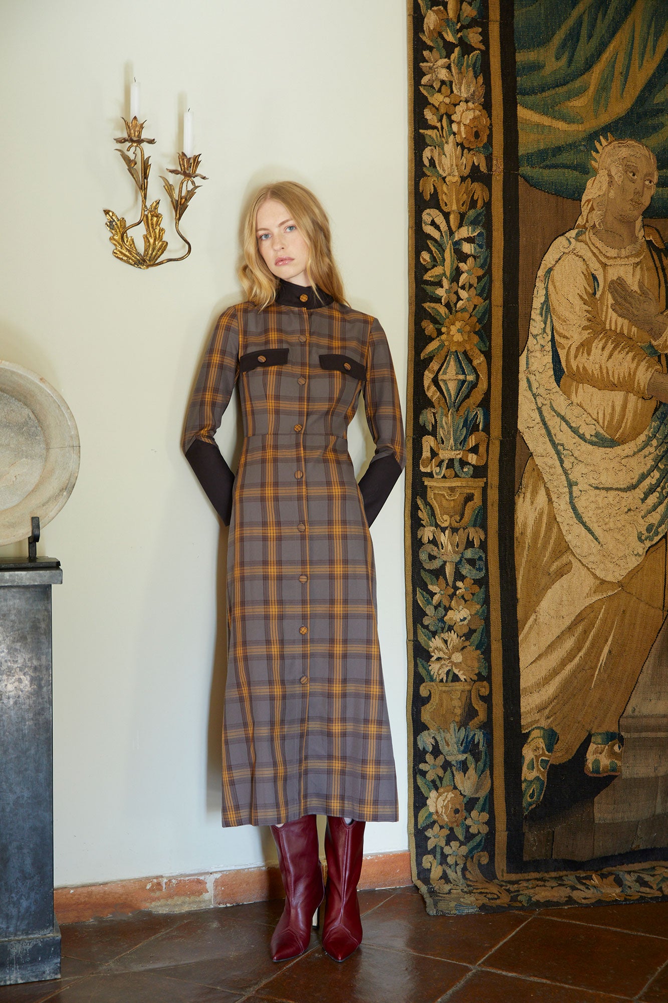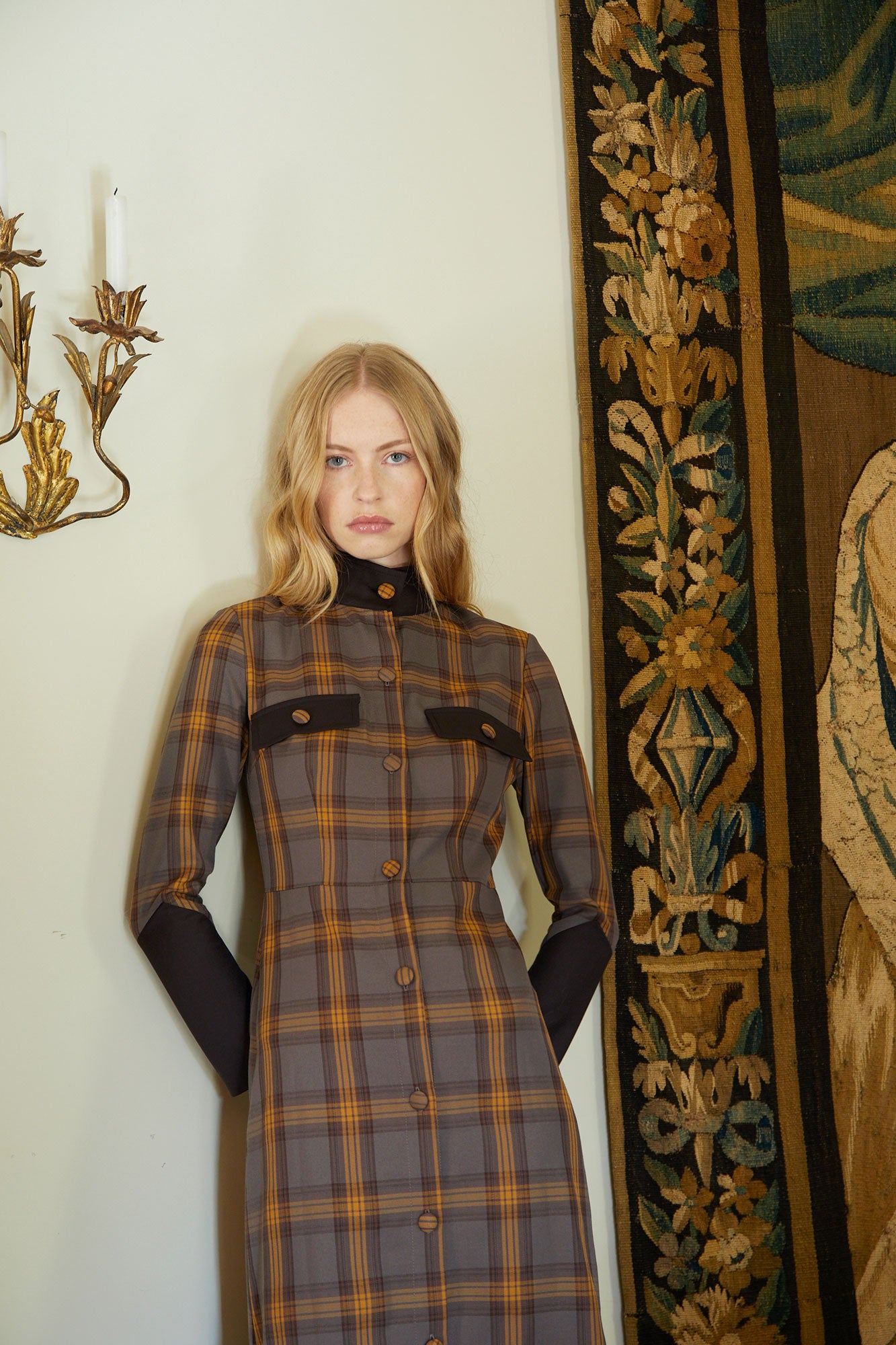 El Vestido Adriel es la prenda perfecta para mujeres con estilo que buscan un look elegante y sofisticado esta temporada. Con un diseño entallado, cuello camisero y manga larga ajustada, este vestido combina el encanto retro con un aire contemporáneo. Su estampado de cuadros en tonos tierra y mostaza realza la figura y aporta calidez, mientras que los bolsillos decorativos en el pecho y los botones frontales añaden un toque de estructura.