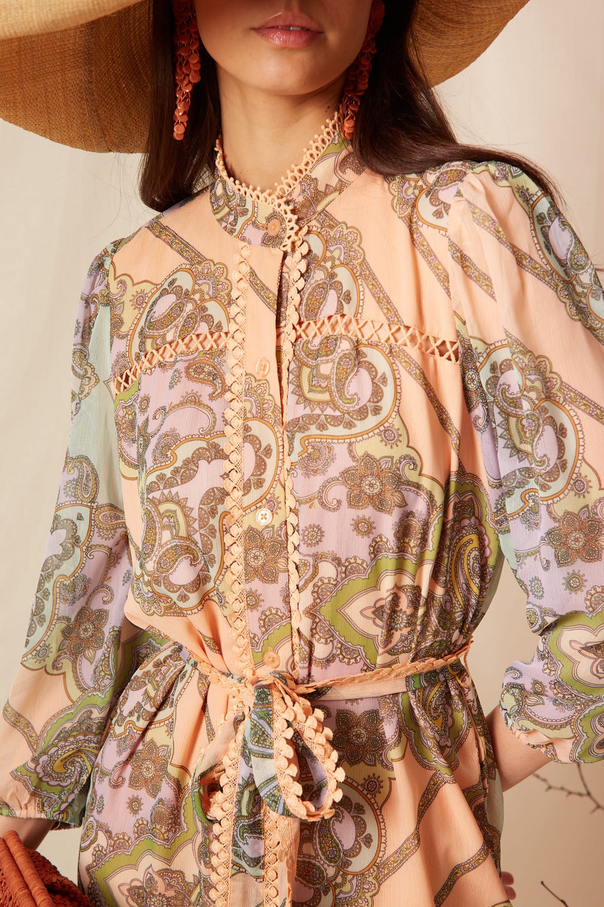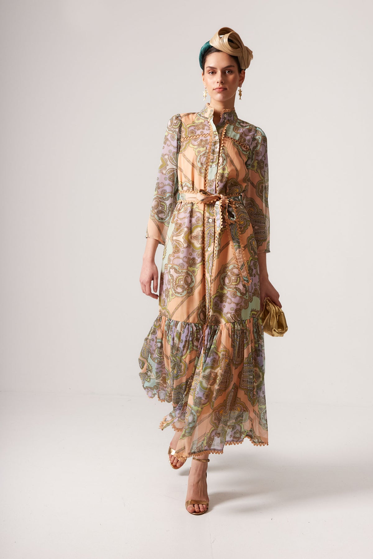 Su estampado en tonos salmón, verdes y matices suaves crea un efecto visual único y luminoso, ideal para bodas de primavera-verano, eventos de día y celebraciones al aire libre. El diseño incorpora cuello ligeramente subido con detalle frontal, manga tres cuartos y cinturón a juego que define la cintura, estilizando la figura de forma sutil y favorecedora. El volante en el bajo añade dinamismo y un aire romántico contemporáneo.