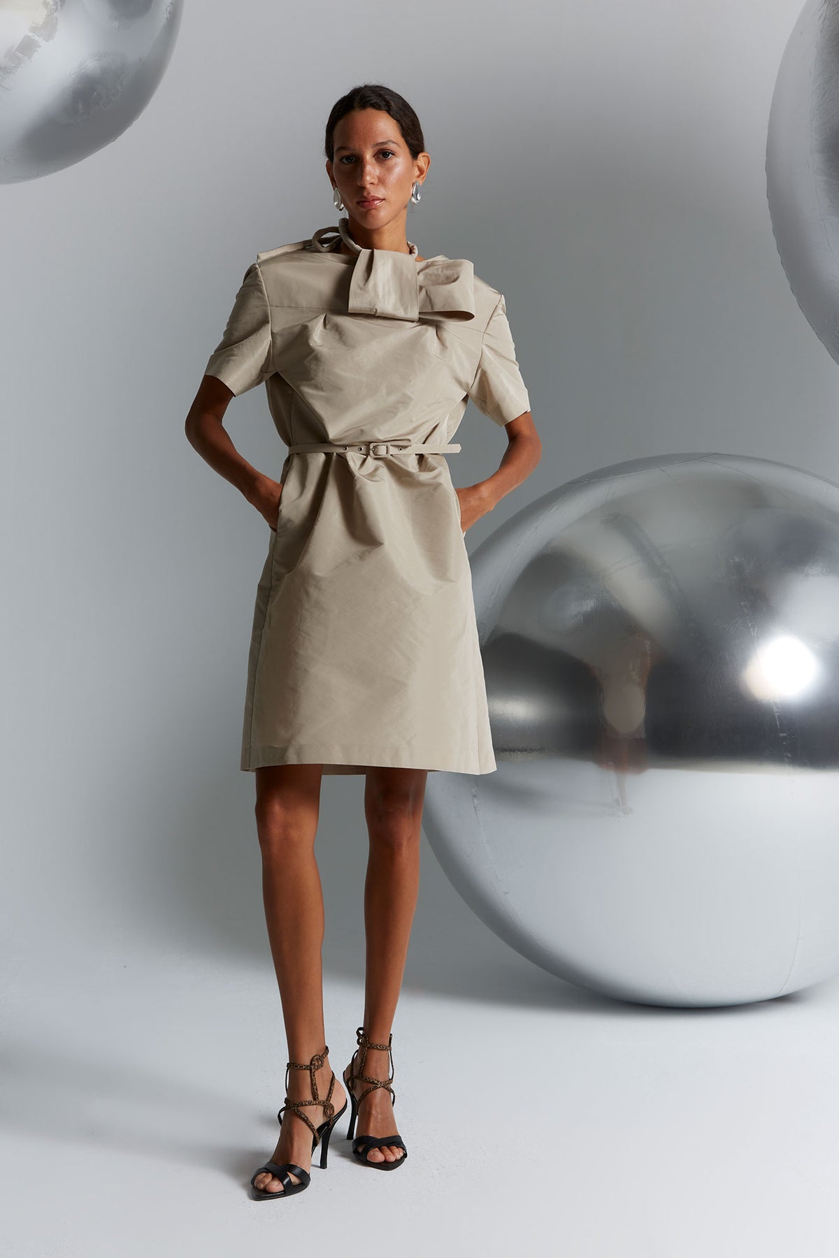El vestido incorpora manga corta estructurada, que equilibra la silueta y refuerza su carácter contemporáneo. La prenda se acompaña de un cinturón fino desmontable, que permite ajustar la cintura y transformar la silueta según el estilo deseado: más marcada y femenina al llevarlo, o más minimalista y relajada al retirarlo.