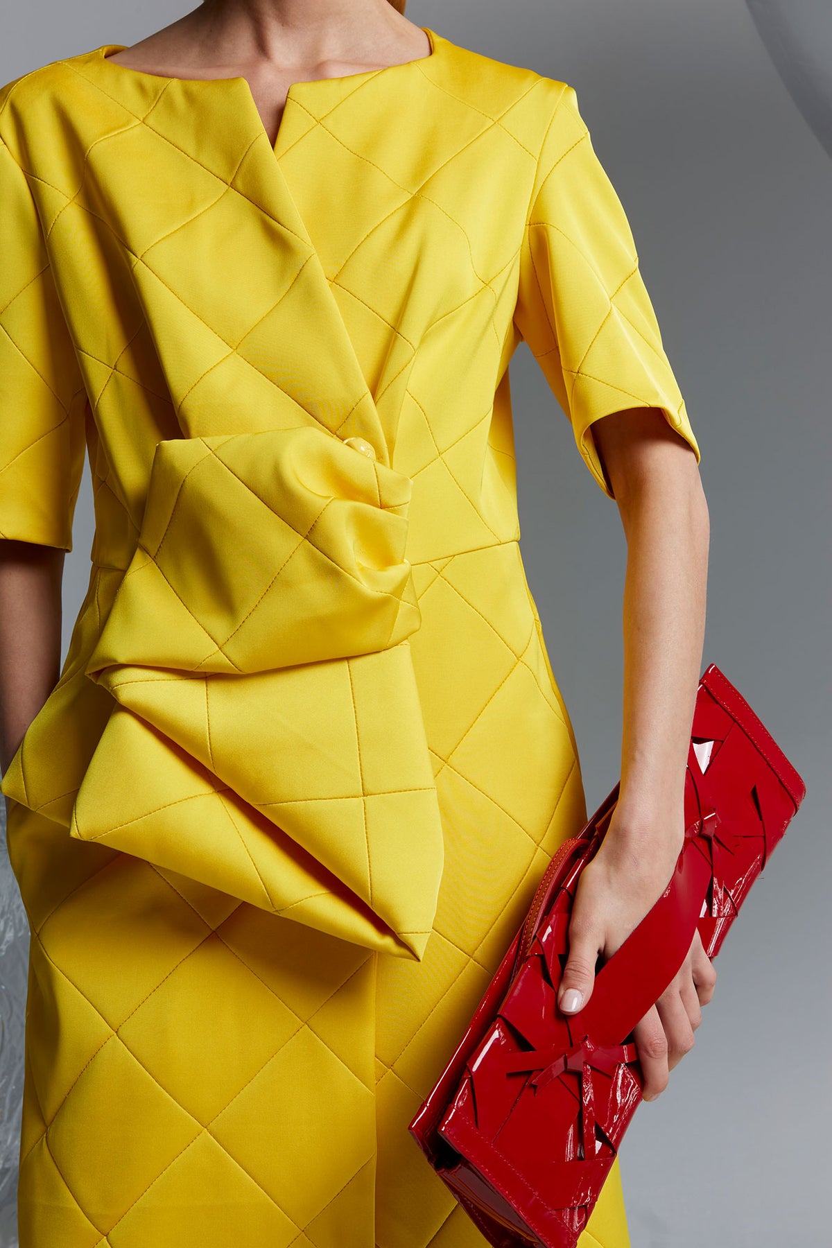 Confeccionado en tejido amarillo luminoso con patrón geométrico acolchado, el vestido presenta una textura elegante que aporta profundidad visual y una estética moderna. Su silueta midi estructurada estiliza la figura y mantiene una línea depurada que refleja la elegancia característica del diseñador.