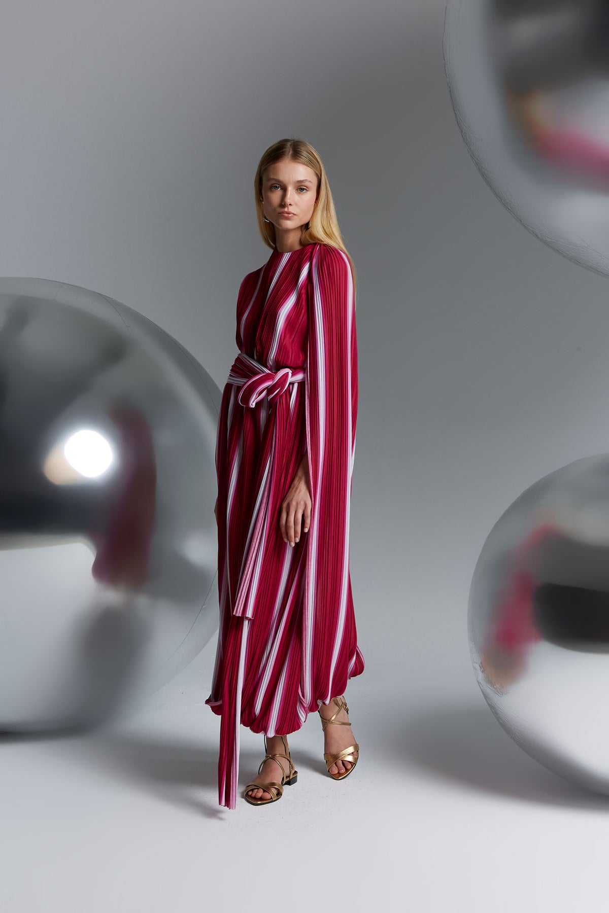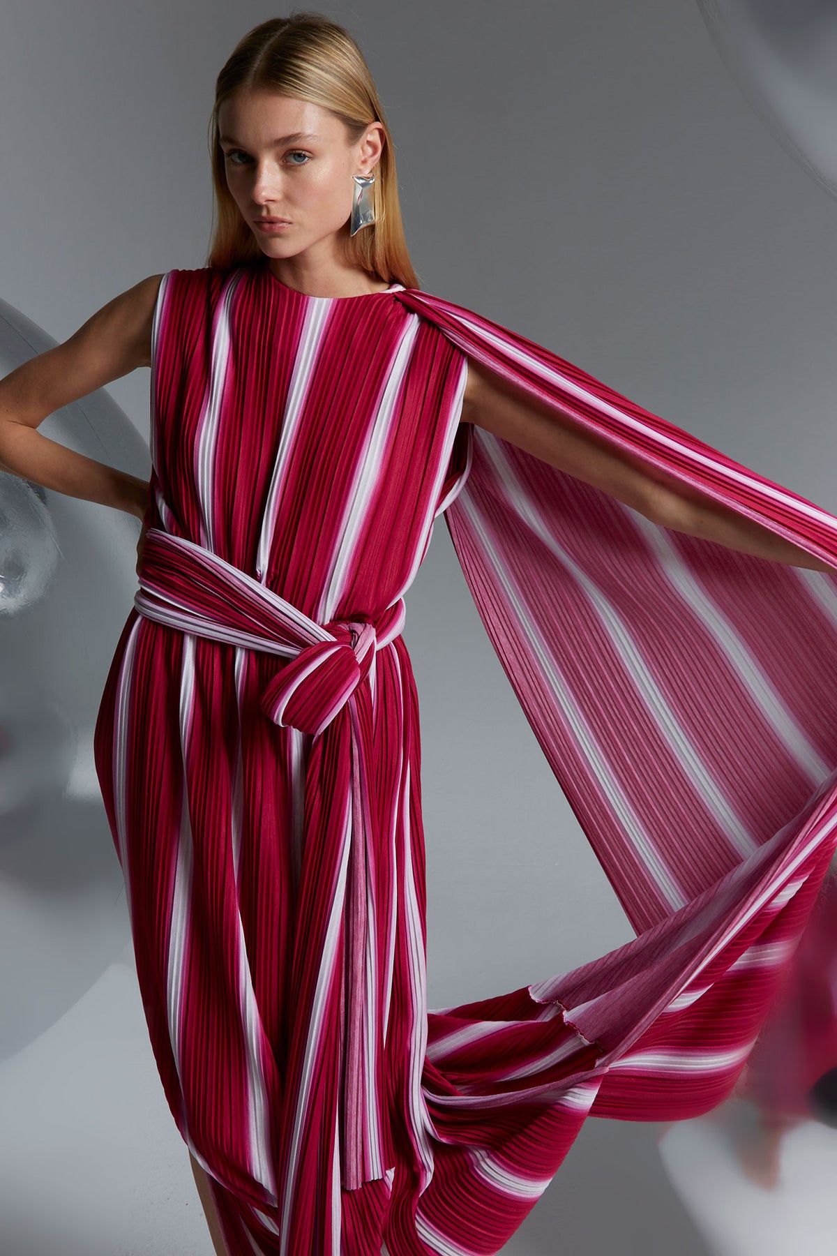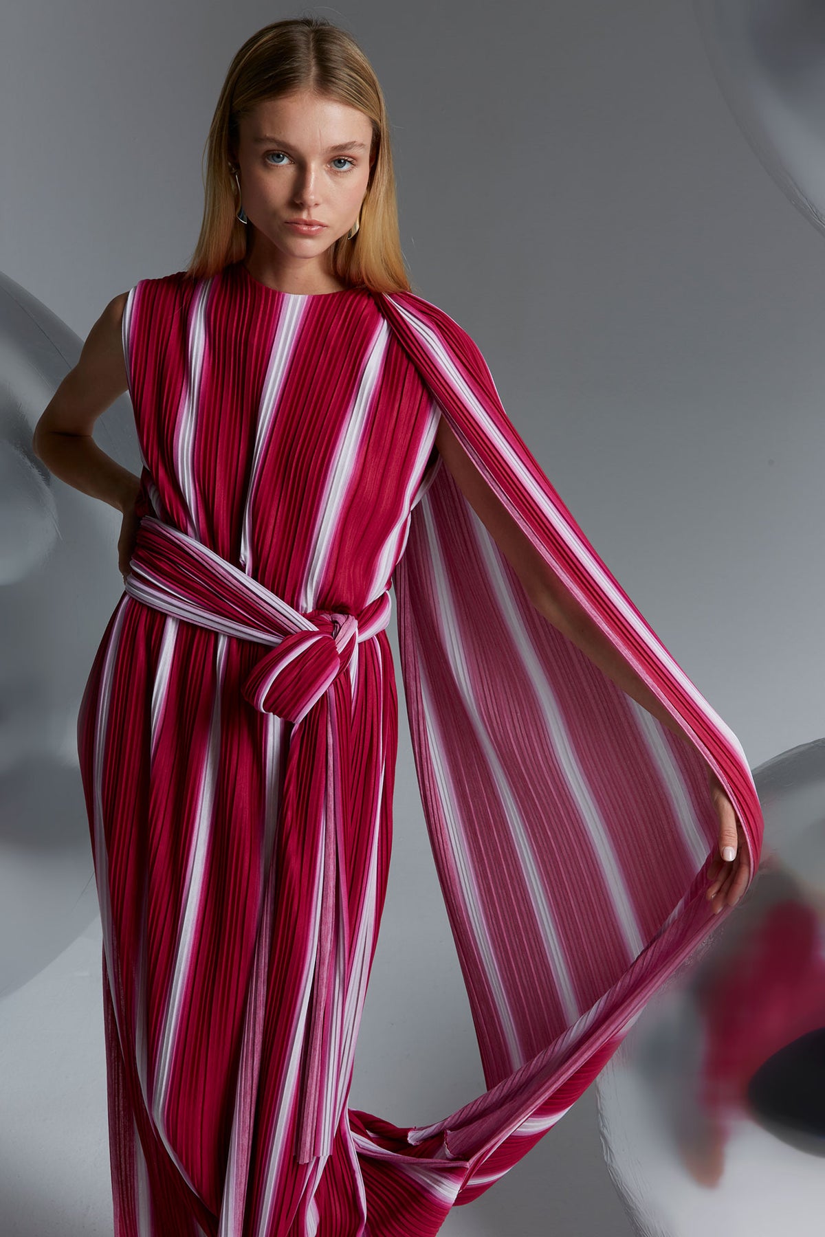 Confeccionado en tejido plisado con estampado de rayas en tonos fucsia, blancos y matices rosados, el diseño crea un efecto visual vibrante que aporta profundidad y movimiento a la prenda. El plisado vertical estiliza la figura y refuerza la sensación de fluidez al caminar.