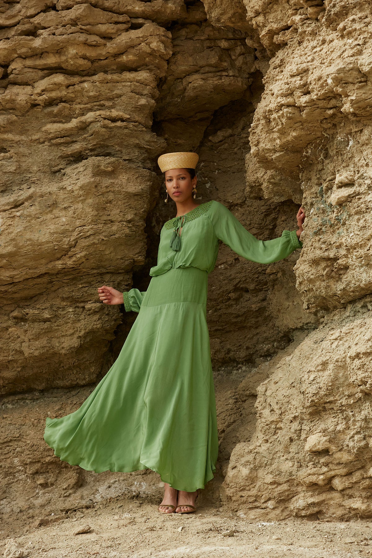 Confeccionado en un tejido ligero con movimiento, este vestido largo verde presenta un escote redondo con delicados detalles decorativos y lazada frontal, que aporta un toque romántico y refinado al diseño. Sus mangas largas ligeramente abullonadas con puño ajustado añaden elegancia y equilibrio a la silueta.