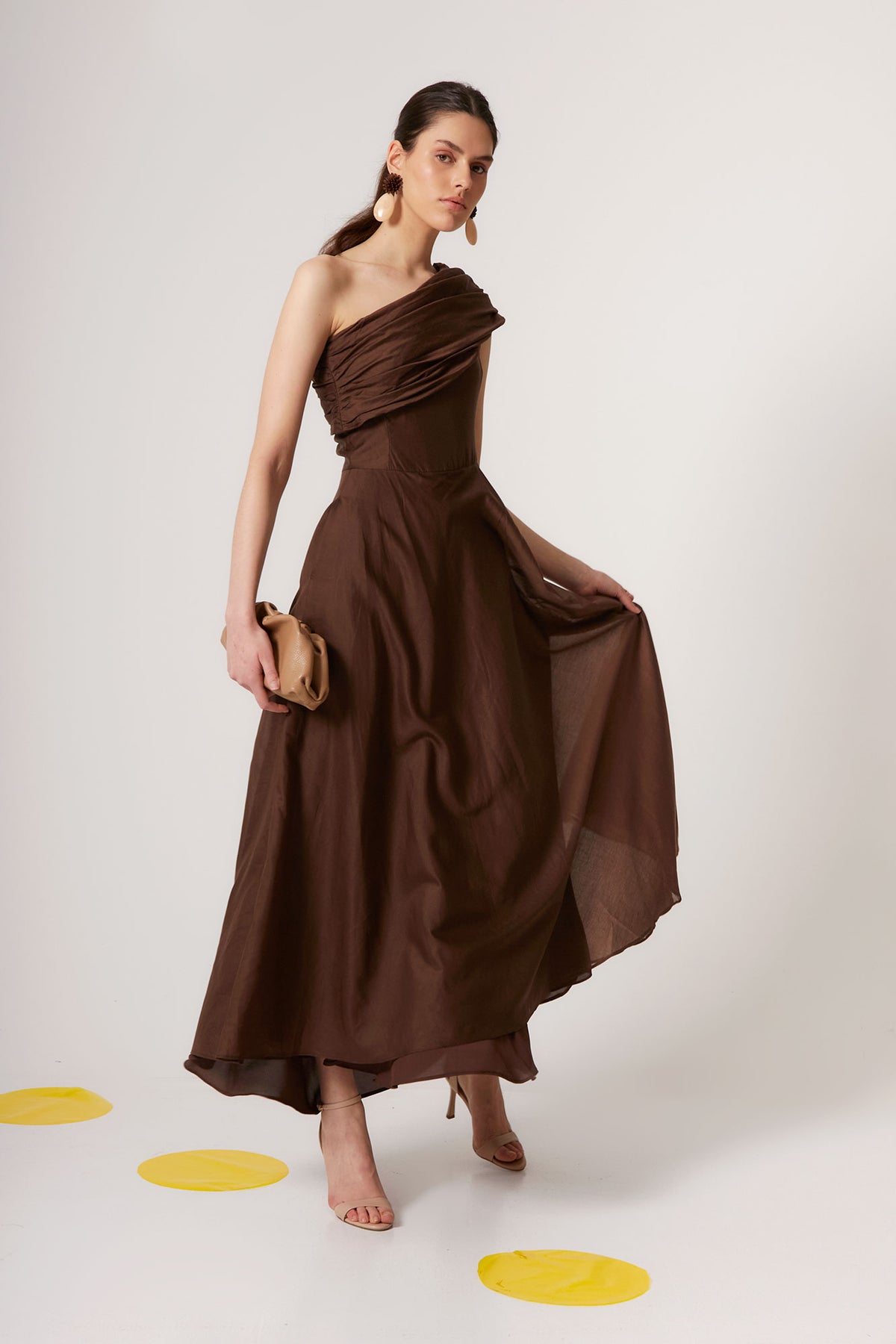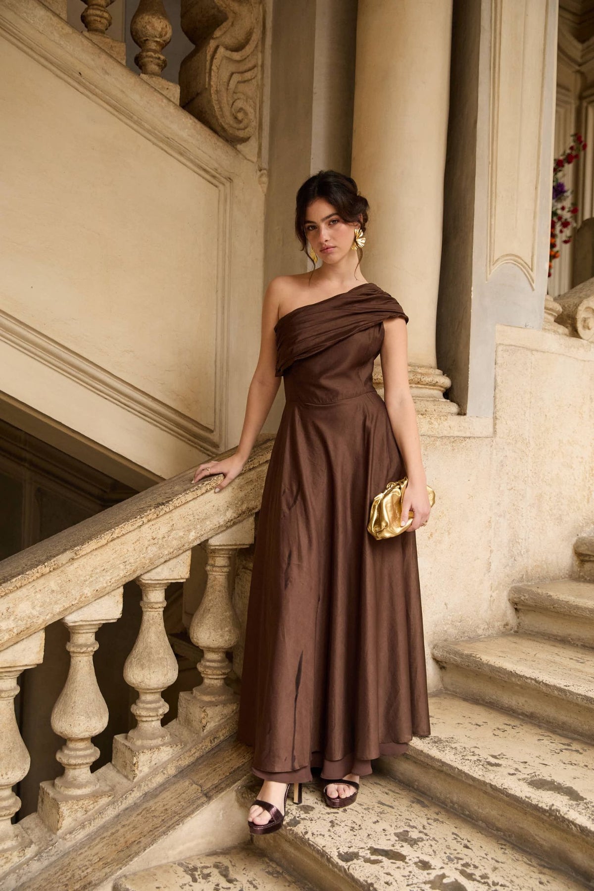 El Vestido Ginebra Marrón de Coosy es una oda a la elegancia atemporal con inspiración romana. Una silueta sofisticada que captura el espíritu de La Dolce Vita: feminidad, movimiento y lujo discreto.