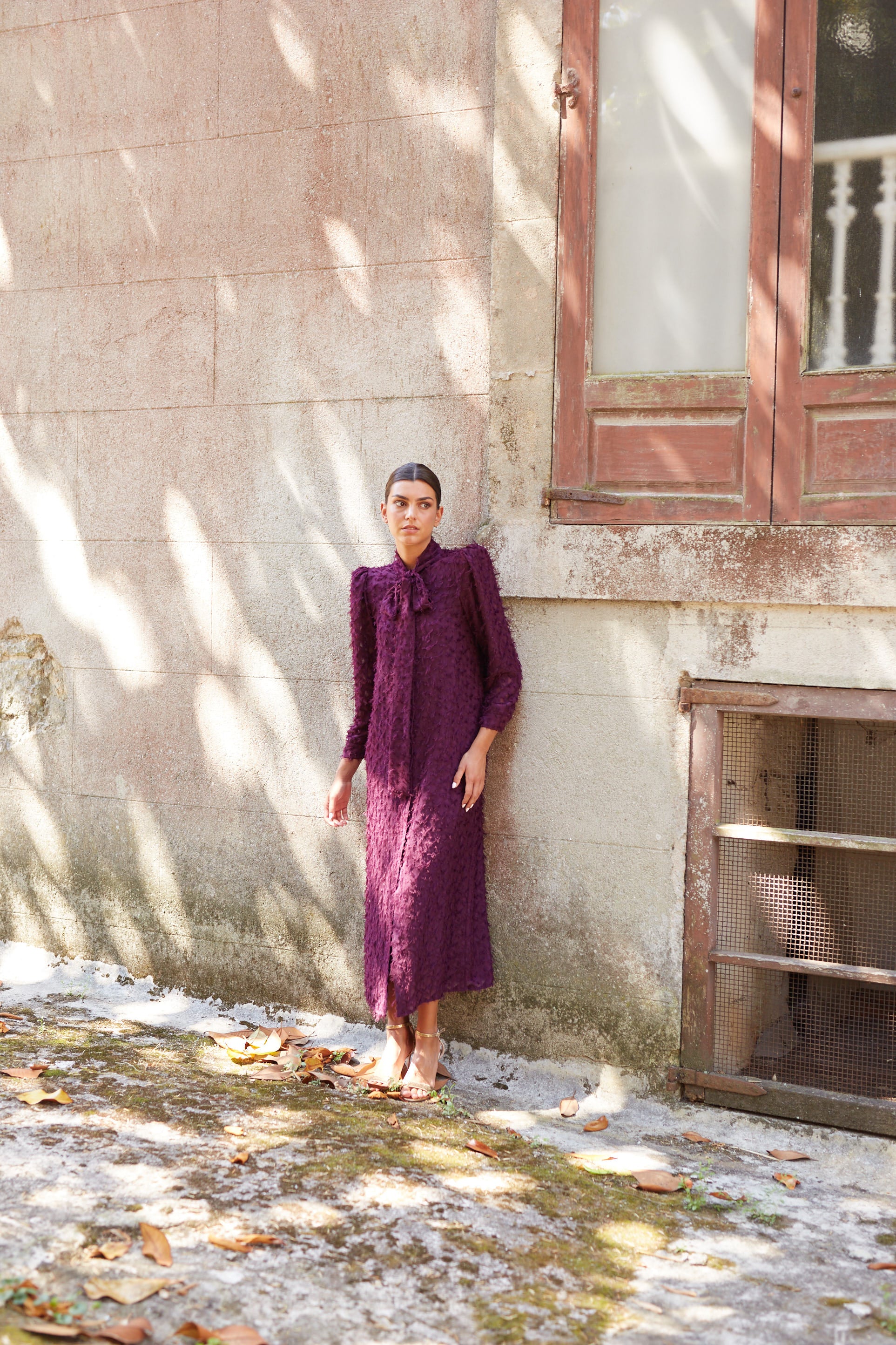 El vestido Janice es la elección ideal para quienes buscan un look sofisticado, femenino y lleno de personalidad. Diseñado en un tejido con textura delicada, destaca por su cuello con lazo anudado, que aporta un toque romántico y chic, y por sus mangas largas abullonadas, perfectas para entretiempo o eventos de noche.