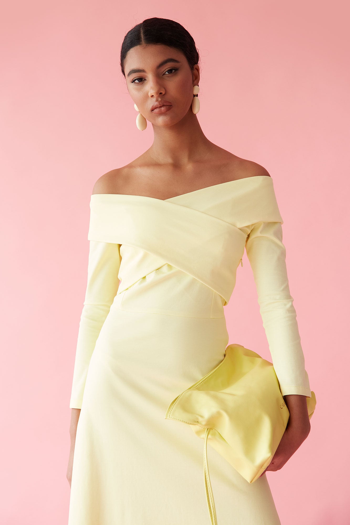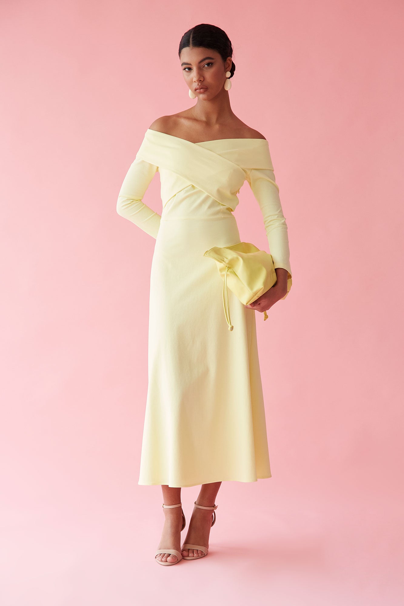 Si buscas un vestido que combine sofisticación, feminidad y un toque de sensualidad, este vestido amarillo midi con escote Bardot es la elección perfecta. Su diseño cuidadosamente elaborado resalta la figura de manera elegante, mientras que su tonalidad vibrante lo convierte en una opción ideal para cualquier evento especial.