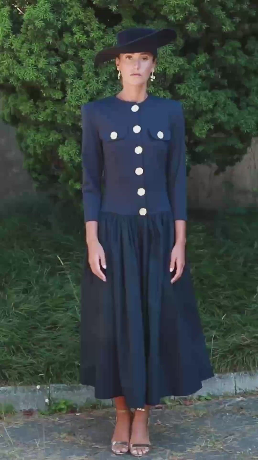 Aporta un aire sofisticado y atemporal a tu look con este vestido midi azul marino, diseñado con botones joya en contraste que realzan su estilo único. Su parte superior entallada con cuello redondo y mangas francesas aporta elegancia, mientras la falda con volumen sutil crea un movimiento delicado y favorecedor. Ideal para bodas de día, eventos de otoño o celebraciones con dress code especial, es una prenda versátil y chic para la invitada que quiere destacar sin renunciar a la comodidad.