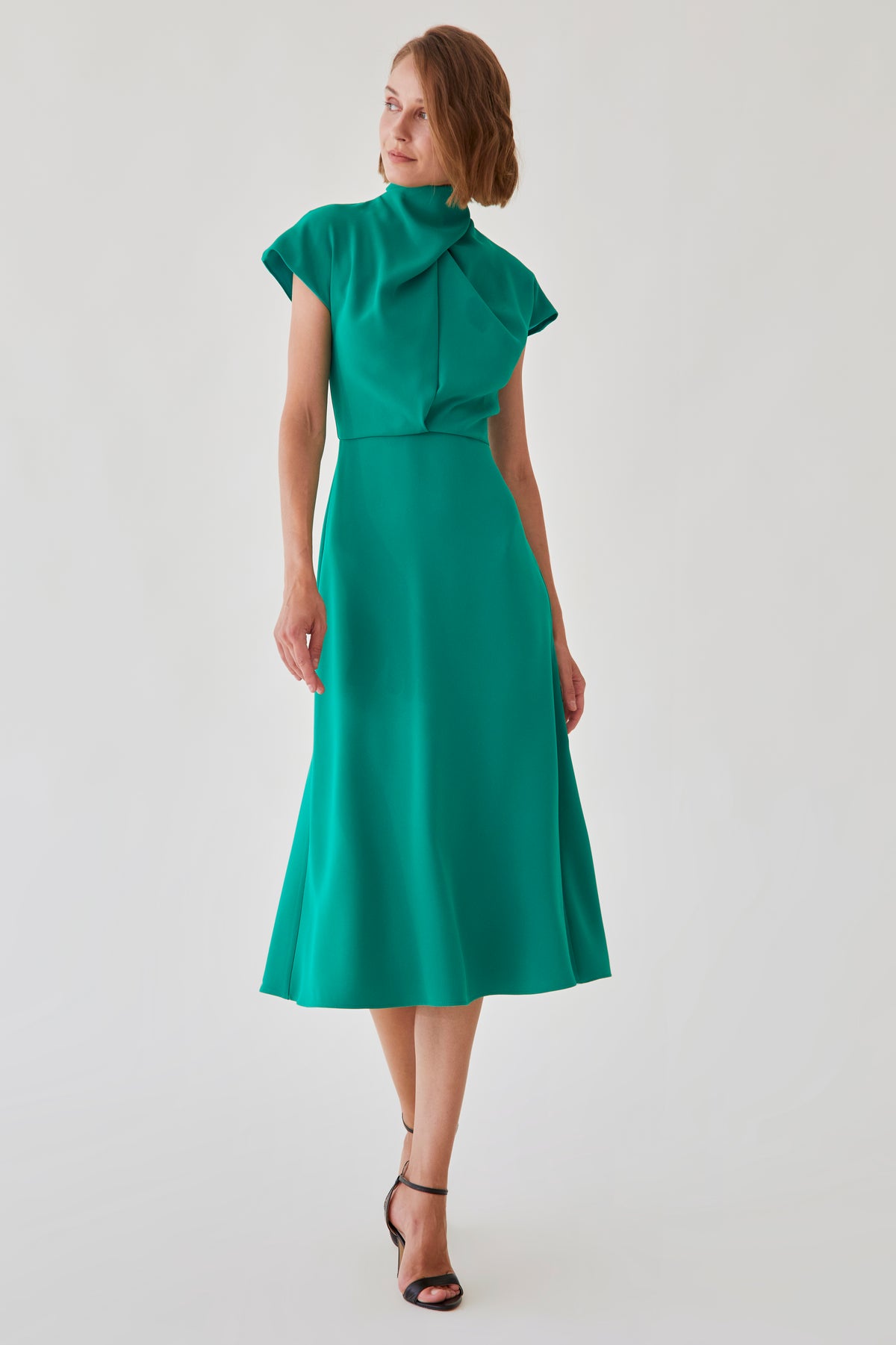 Este vestido, diseñado para realzar tu figura con sutileza y estilo, combina un corte sofisticado con un vibrante tono verde que no pasará desapercibido. Su cuello alto y mangas cortas le añaden un toque moderno y refinado, ideal para eventos donde quieras destacar con una elegancia discreta. Perfecto para combinar con tacones y accesorios minimalistas, este vestido es la opción ideal para cualquier ocasión especial.