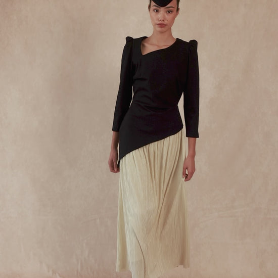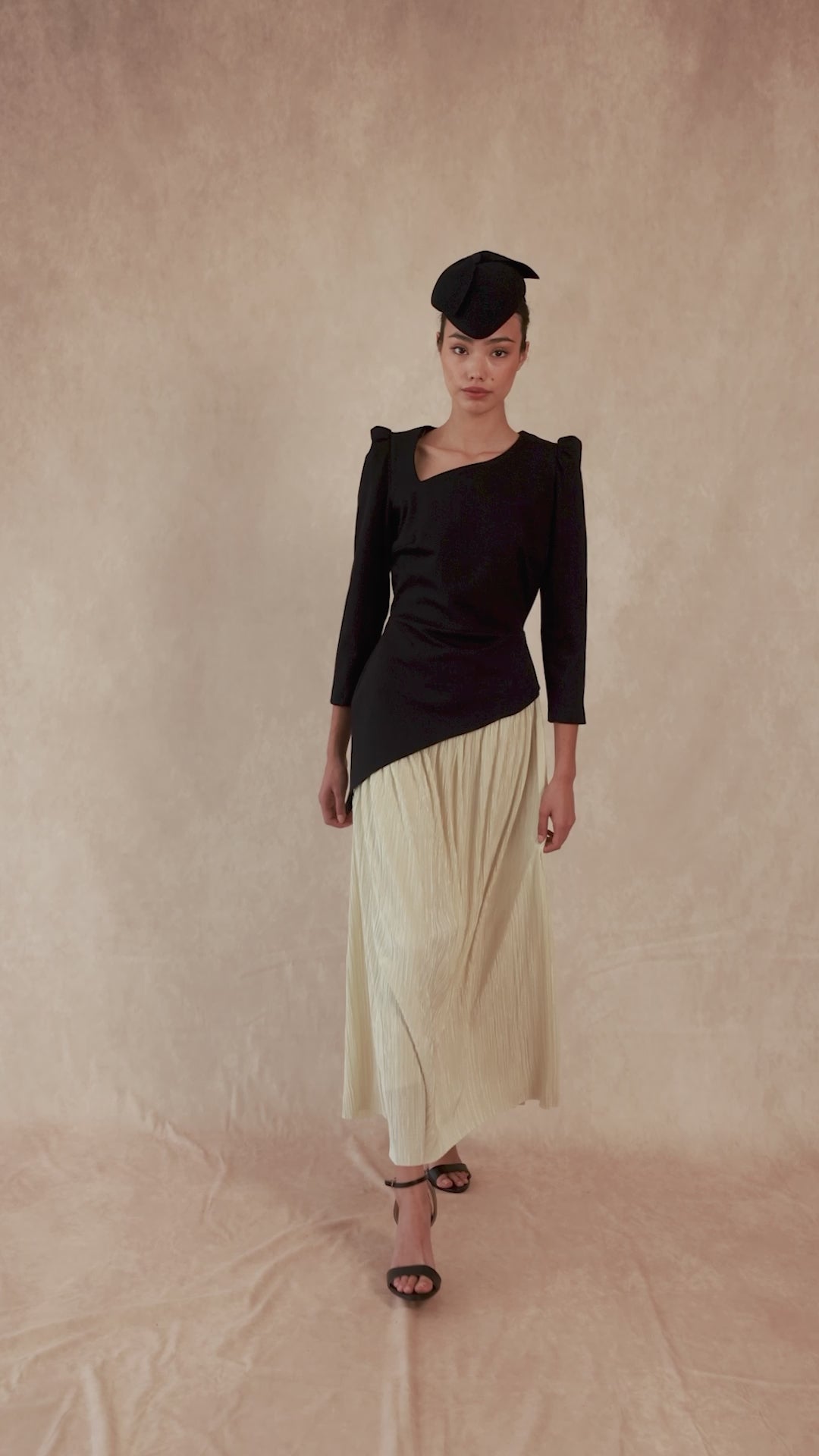 El Vestido Raquel Negro es una oda a la elegancia contemporánea. Su diseño combina un cuerpo negro estructurado, con hombreras sutiles y escote geométrico, con una falda plisada dorada de caída fluida que aporta movimiento, luz y sofisticación.