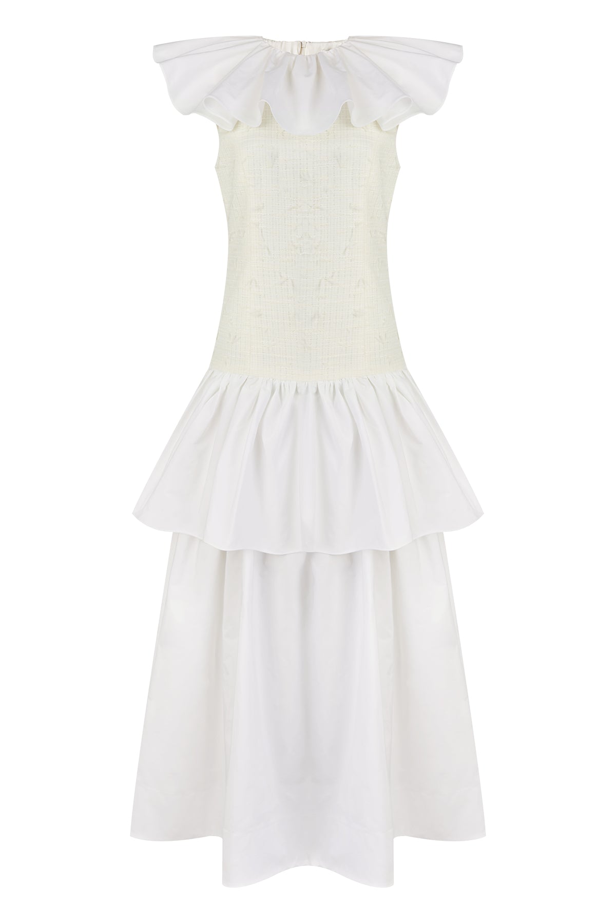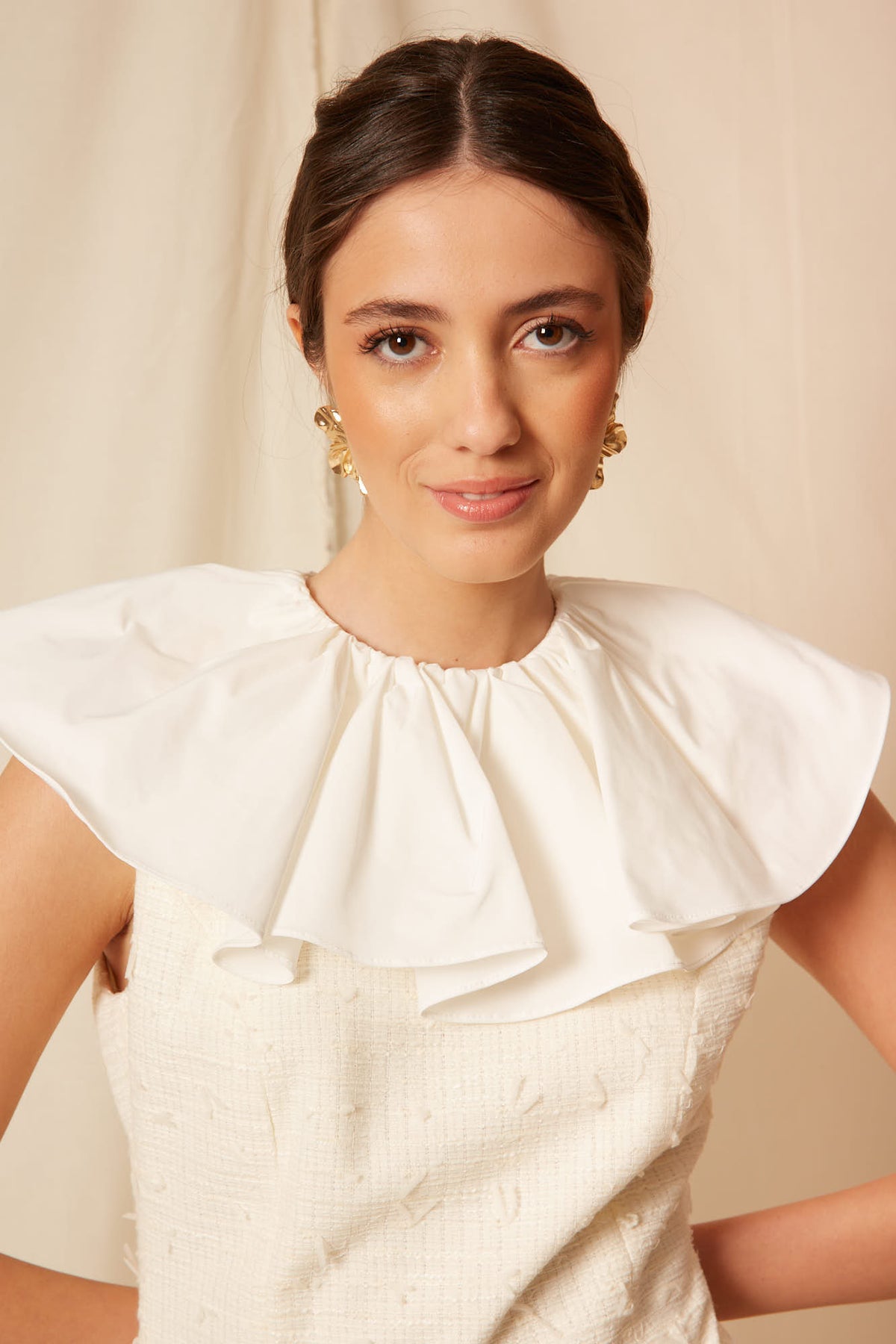 El protagonista absoluto es su cuello volante estructurado, etéreo y ligero, que enmarca el rostro con sutileza y aporta un aire poético y casi ceremonial. El cuerpo del vestido presenta una silueta delicada que equilibra estructura y fluidez, realzando la figura con naturalidad y elegancia.