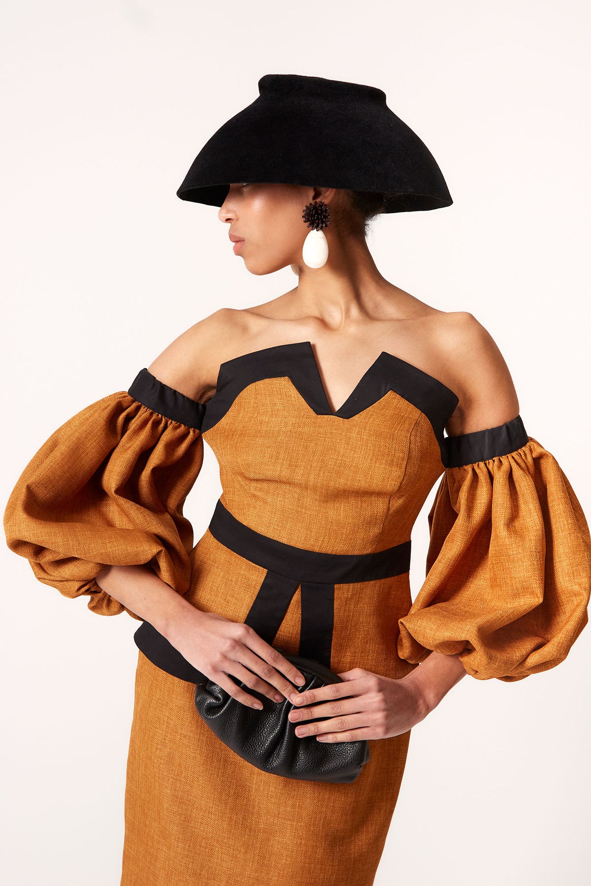 El vestido Sunae de Coosy redefine la sofisticación contemporánea con una silueta estructurada y femenina. Confeccionado en tejido de efecto lino en tono teja cálido, este vestido midi destaca por su escote bardot geométrico, que enmarca los hombros con un diseño angular exclusivo. Las mangas abullonadas aportan volumen y carácter, creando un equilibrio perfecto entre romanticismo y modernidad.
