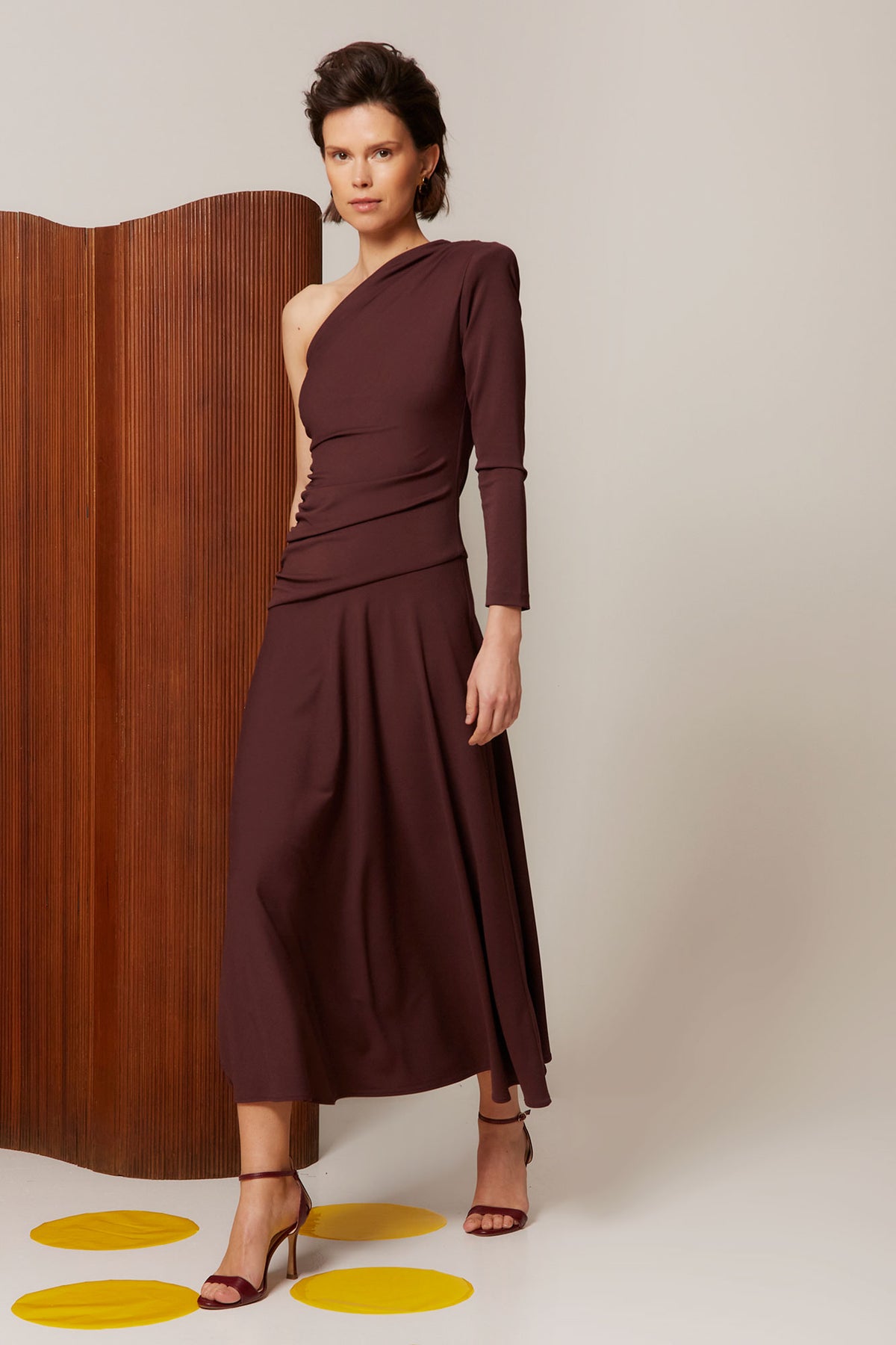 Su escote asimétrico de un solo hombro aporta un aire contemporáneo y femenino, equilibrado por una manga larga ajustada que estiliza la línea del brazo. El cuerpo presenta un delicado drapeado lateral que define la cintura y favorece la silueta, creando un efecto envolvente muy elegante.