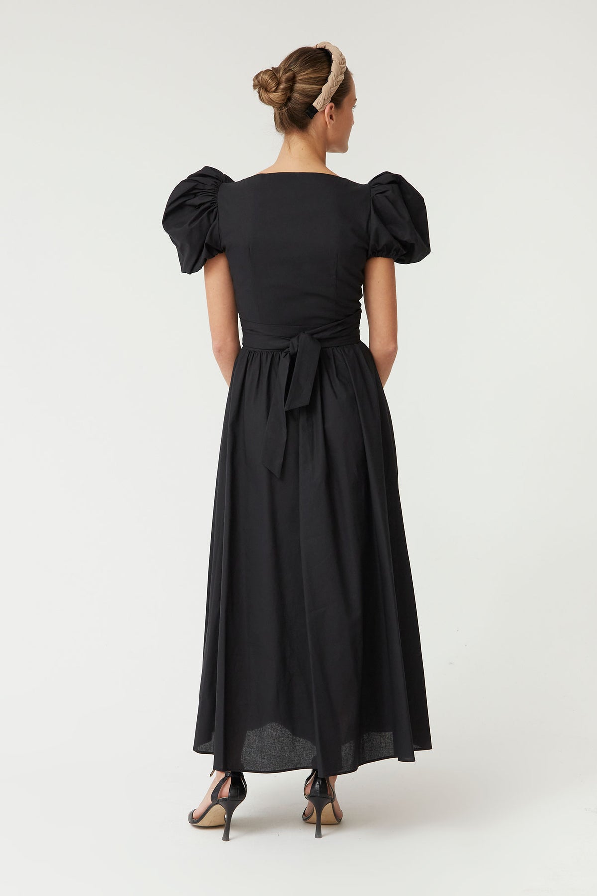 Las mangas abullonadas añaden volumen y carácter al diseño, creando un equilibrio perfecto entre lo clásico y lo moderno. Confeccionado en un tejido de algodón estructurado, este vestido combina comodidad y sofisticación, ideal para bodas de día, cenas especiales o eventos de invitada.