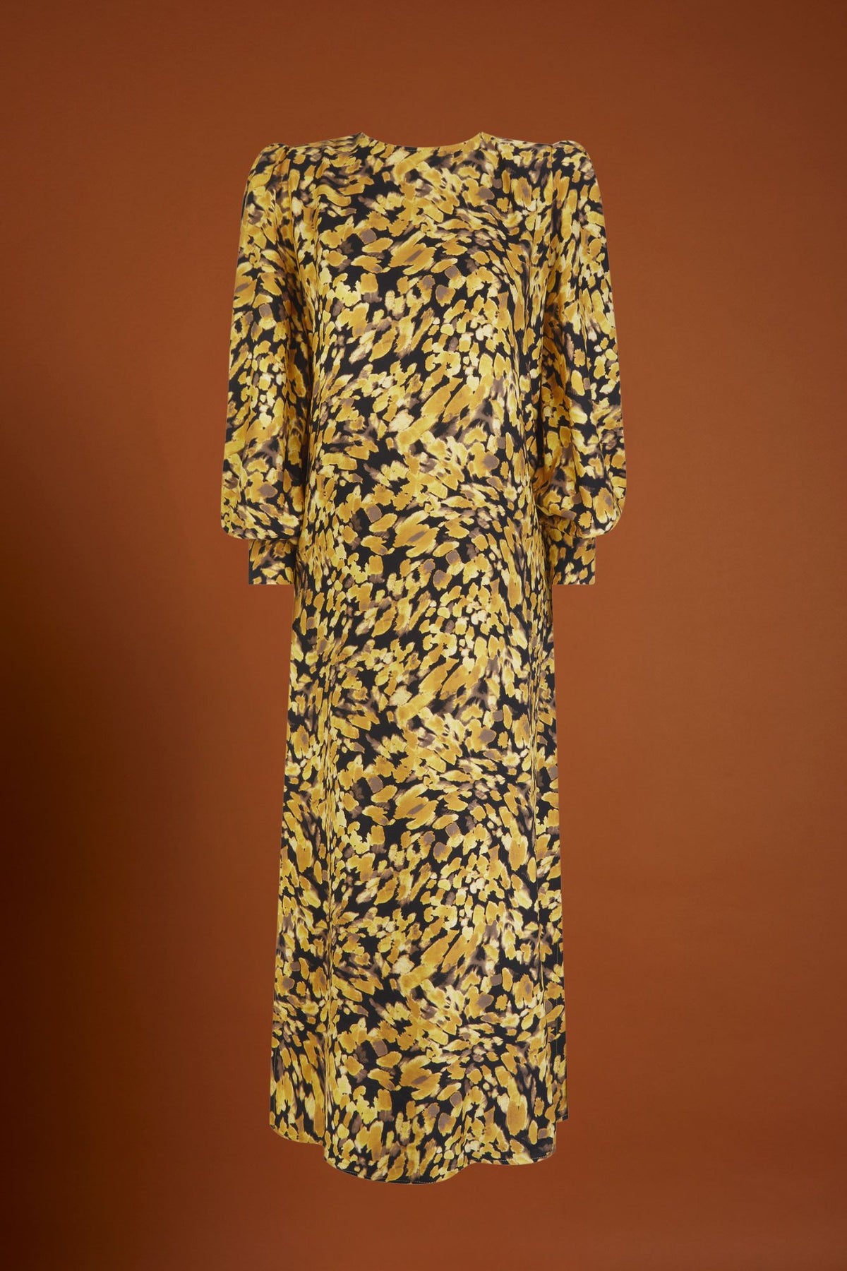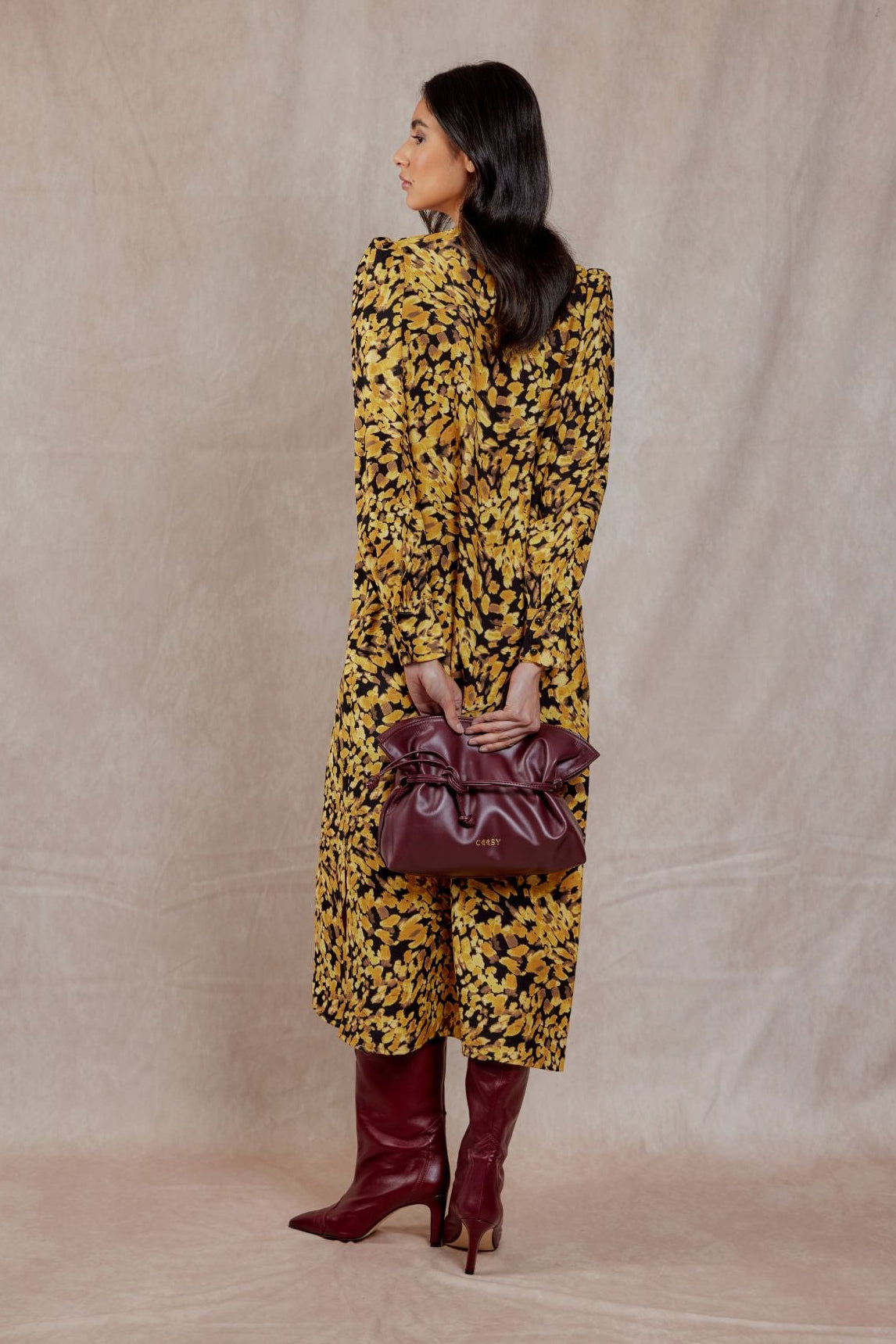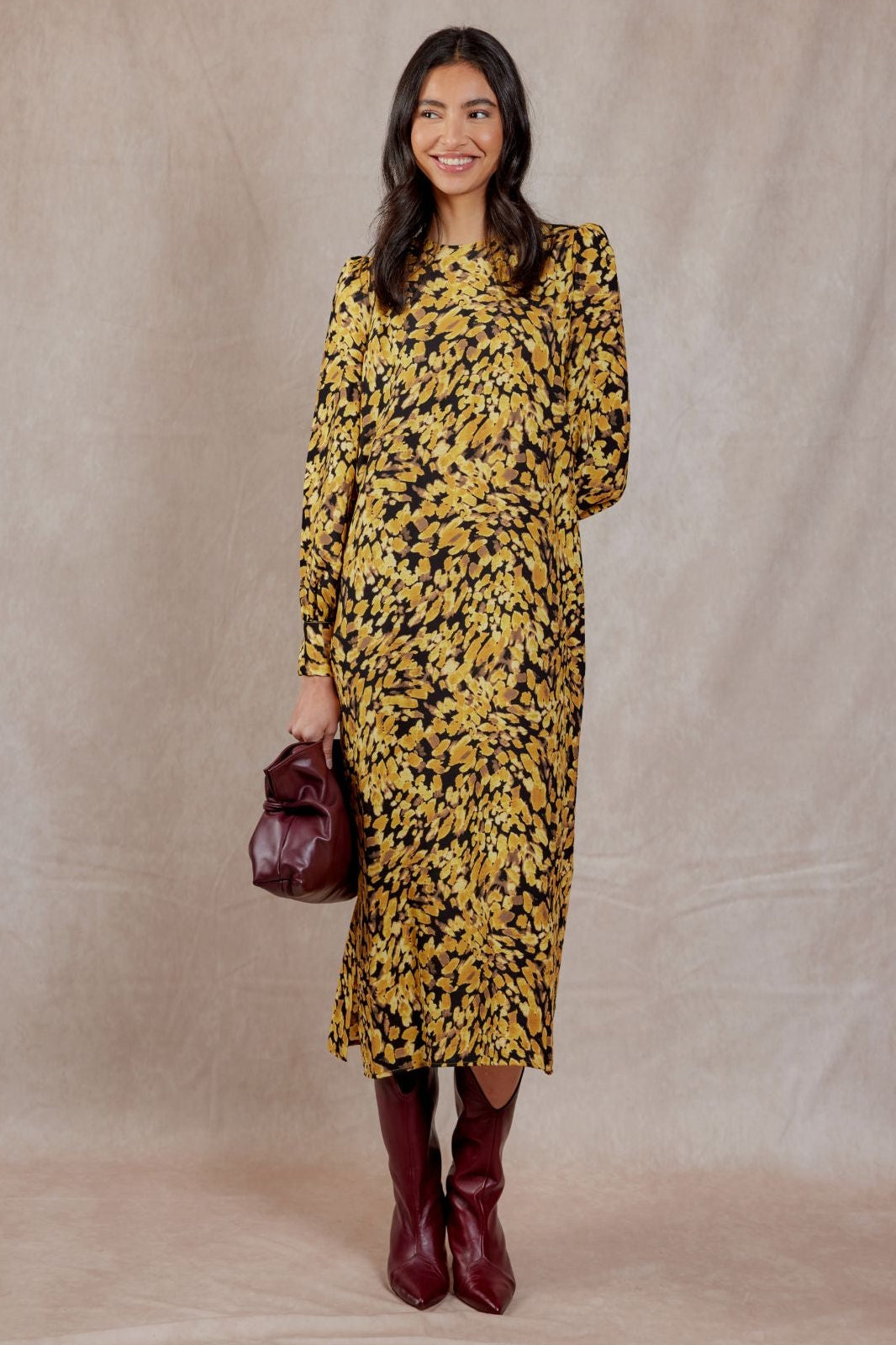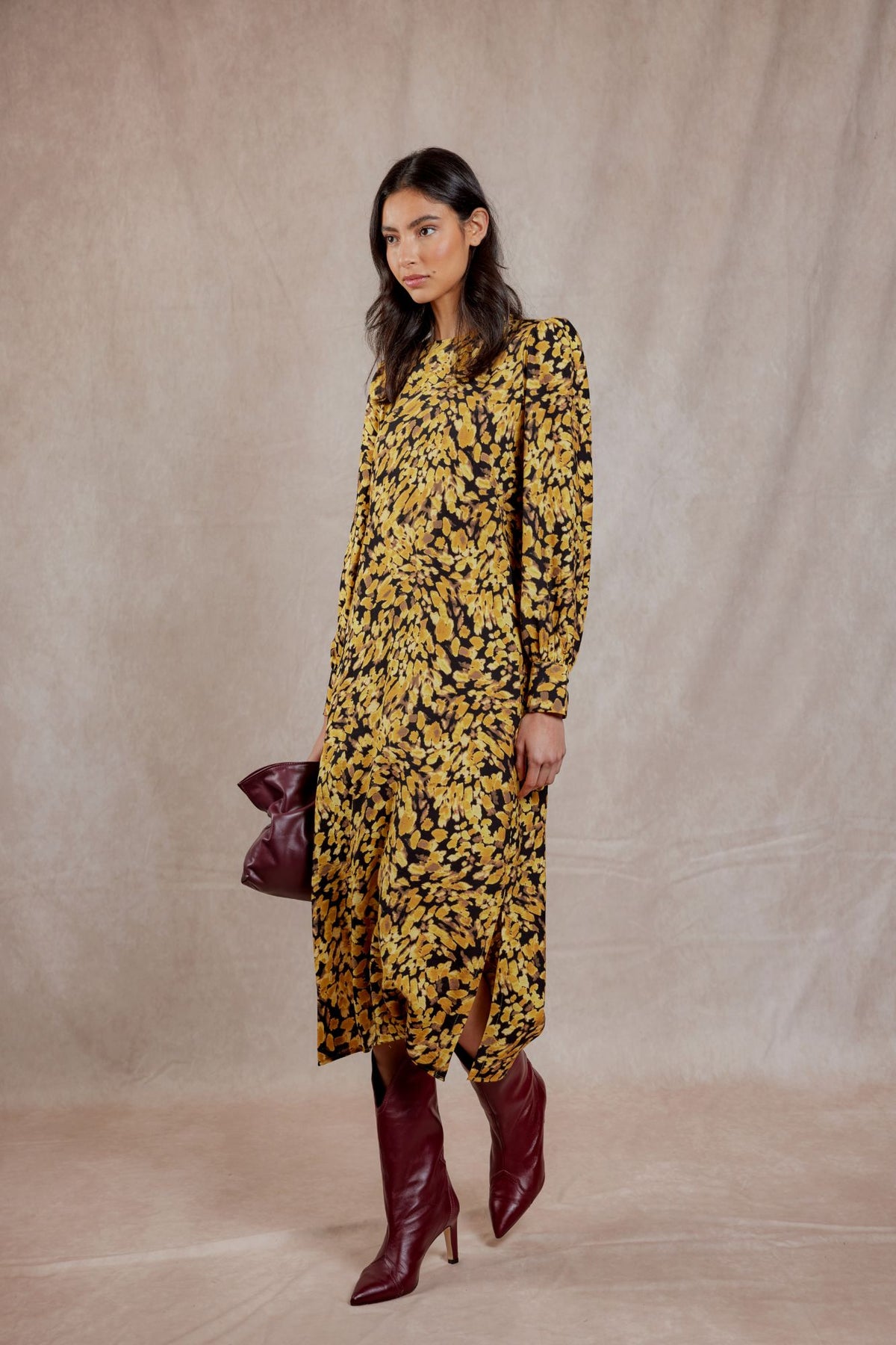 El vestido midi Uriel presenta mangas abullonadas y un corte recto ligeramente evasé, que favorece todo tipo de figuras. Su estilo versátil lo convierte en una opción ideal tanto para un evento de día como para una cena especial o incluso una boda de otoño.