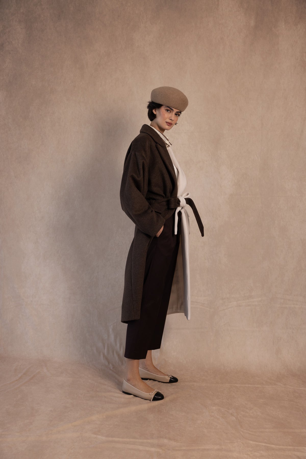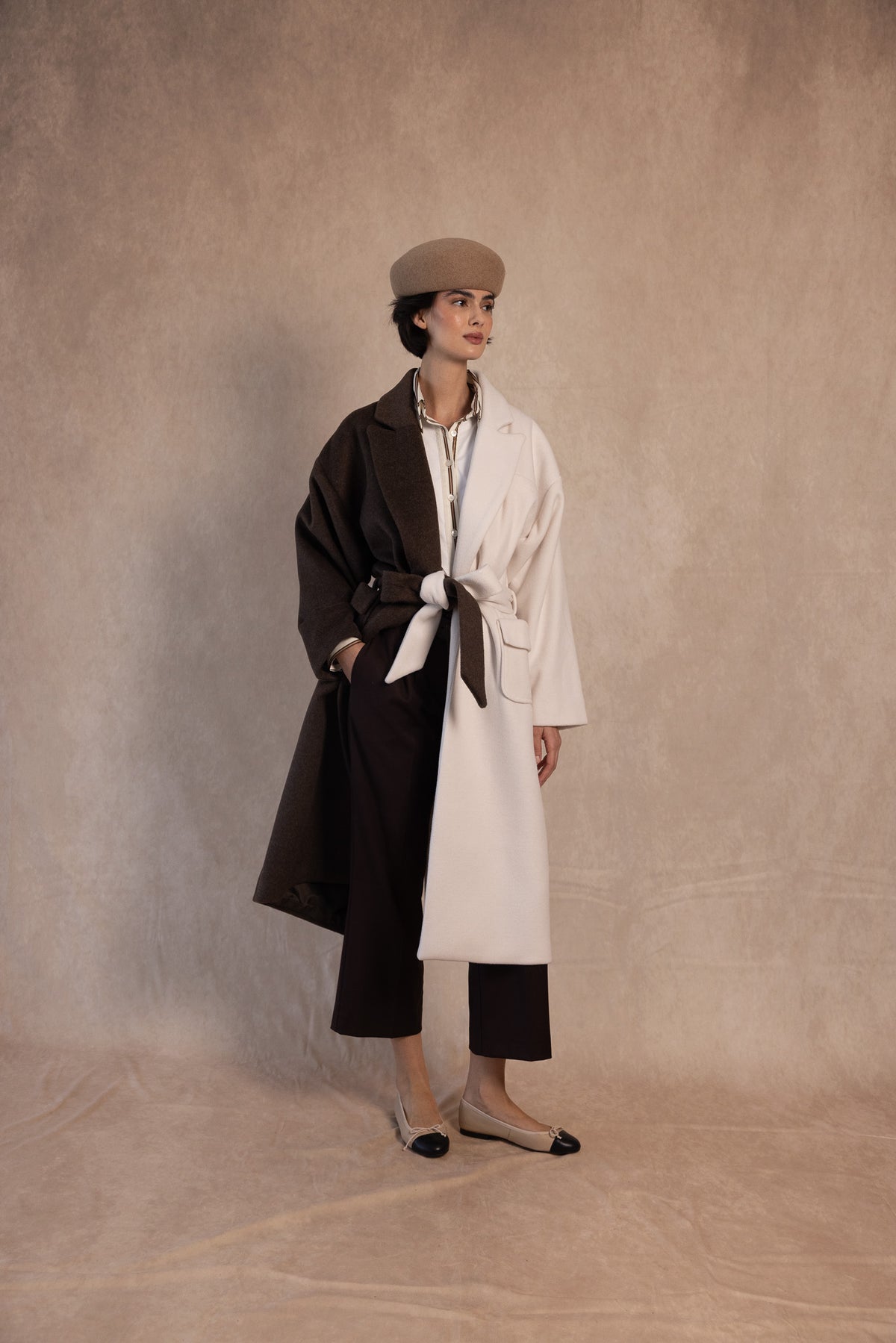 O Casaco Burguete Castanho é a peça de roupa perfeita para esta estação. Com um design bicolor único em castanho e cru, este casaco comprido confere elegância e originalidade a qualquer look. O seu corte reto e sofisticado é complementado por um cinto incluído, ideal para marcar a cintura e dar um toque mais feminino e estilizado.