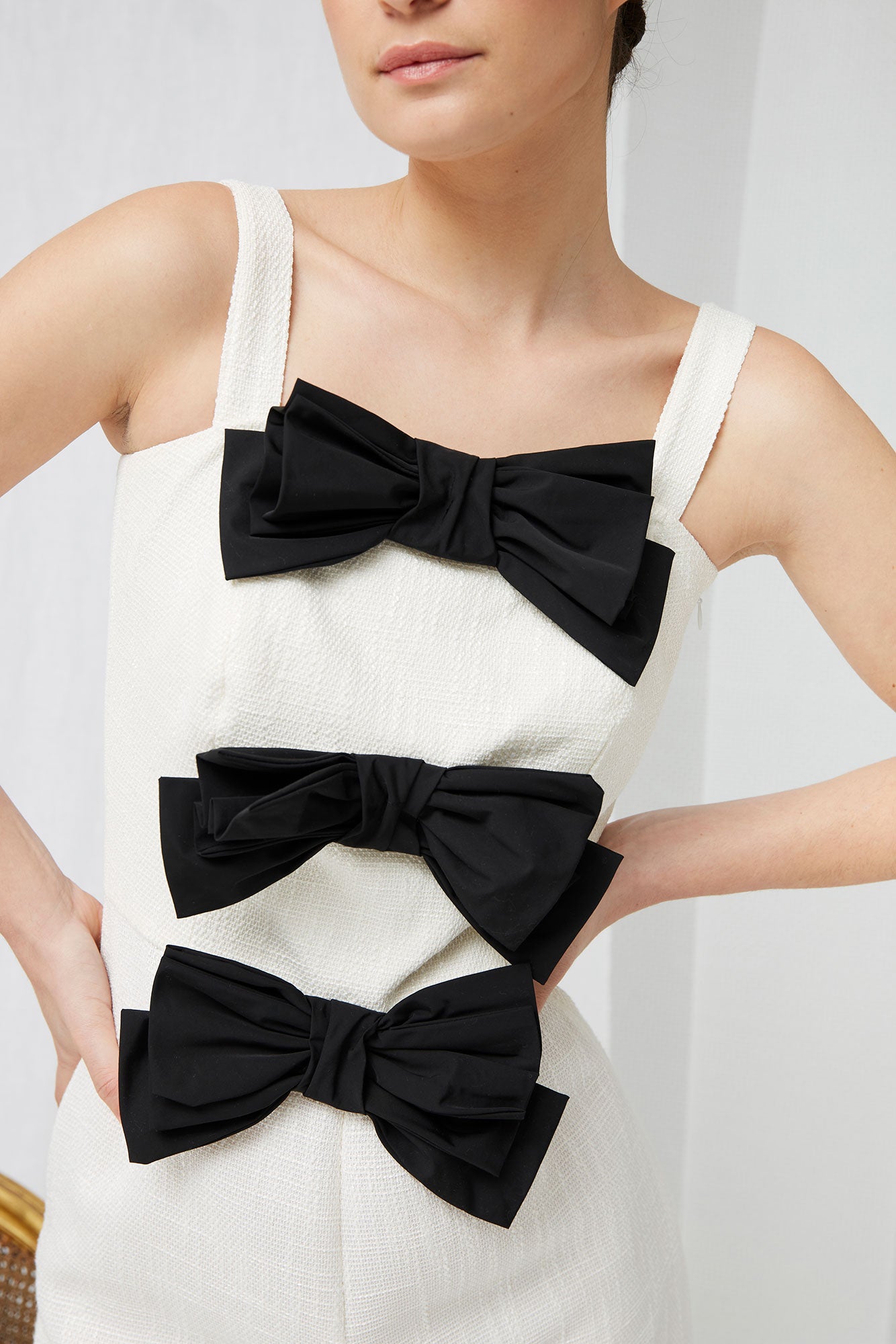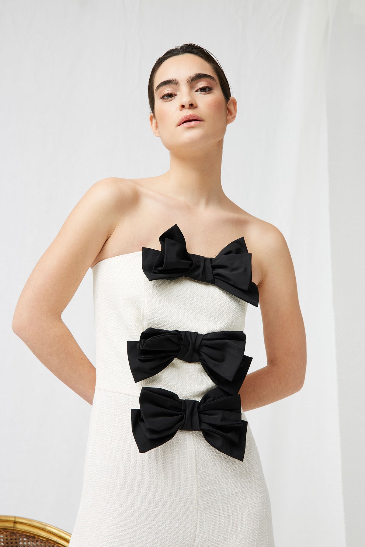 Confeccionado en un tejido con textura sutil, el diseño destaca por sus lazos negros en contraste, colocados estratégicamente en el delantero, que aportan carácter, personalidad y un guiño atemporal al universo couture. Su silueta estiliza la figura y equilibra estructura y fluidez, creando una pieza tan especial como versátil.