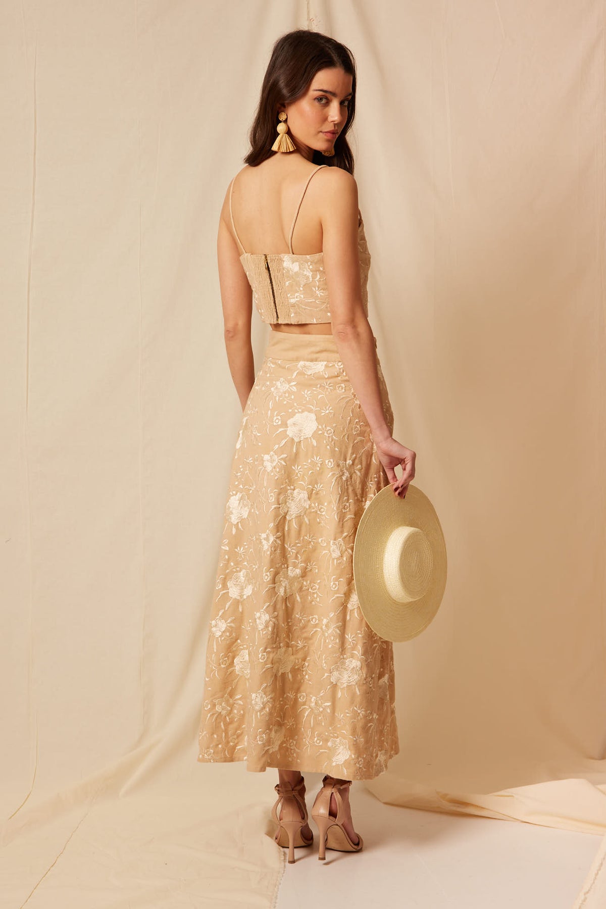 El top Lorenzana está pensado para combinarse con la falda Lorenzana a juego, creando un total look de invitada elegante y armonioso, perfecto para celebraciones especiales. También puede combinarse con otras prendas para lograr looks más versátiles y actuales.