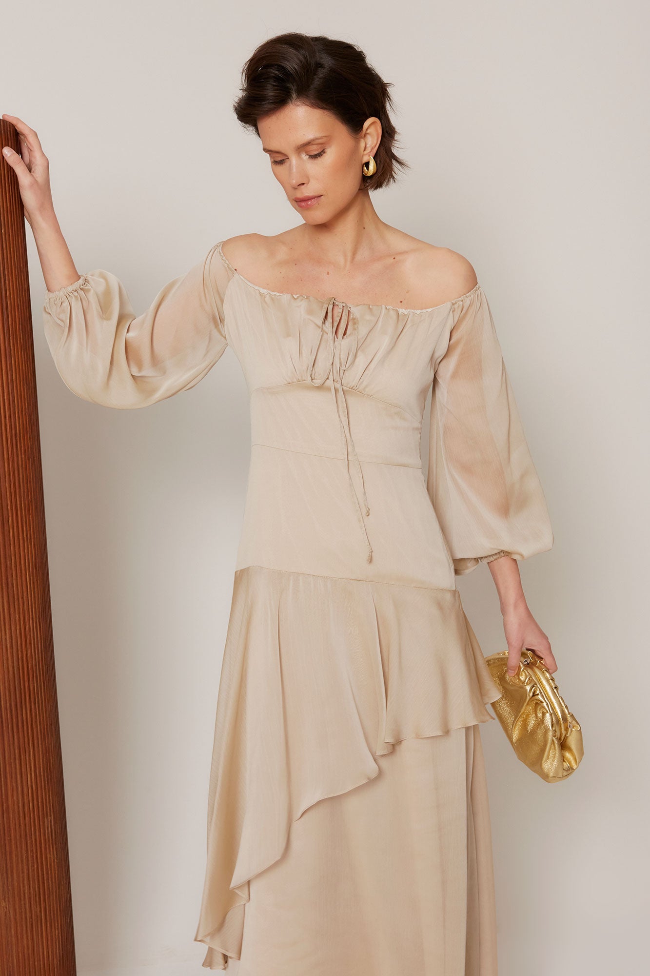 Um vestido longo de convidada com um design pormenorizado, concebido para se destacar com naturalidade e sofisticação.
