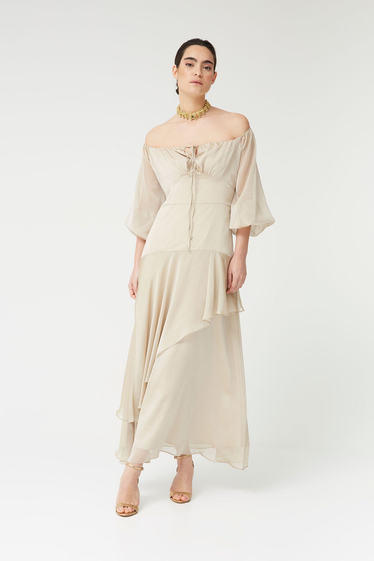 Su diseño off-shoulder realza los hombros y el escote de forma sutil, mientras que las mangas abullonadas aportan un aire romántico y refinado. El cuerpo se ajusta delicadamente a la silueta, estilizando la figura, y se completa con un volante asimétrico en la falda que añade dinamismo y un acabado elegante al conjunto.