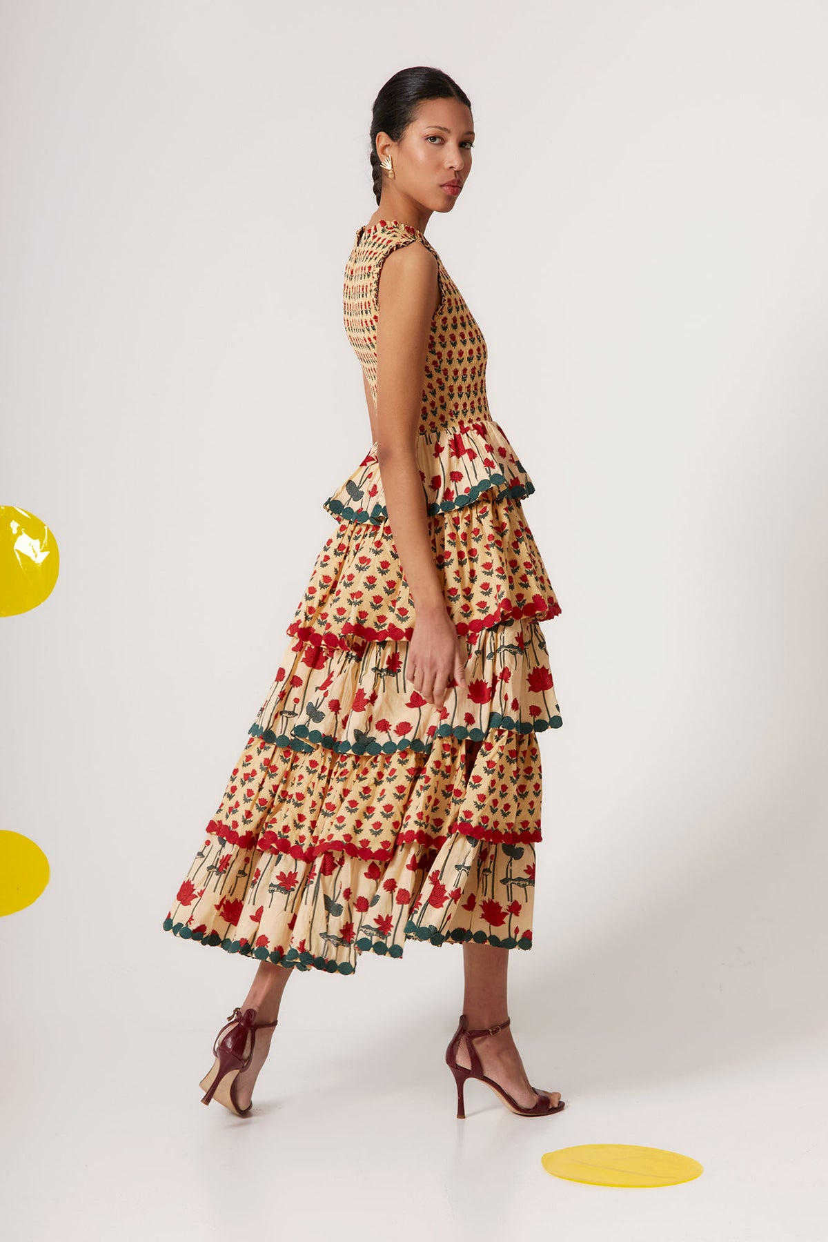 De corte sin mangas y cuello cerrado, presenta un cuerpo entallado que estiliza la figura y marca la cintura con precisión. La falda midi se estructura en capas de volantes fruncidos que aportan volumen, movimiento y un efecto visual ligero y dinámico. Los detalles en contraste verde en los remates añaden profundidad y sofisticación al conjunto.